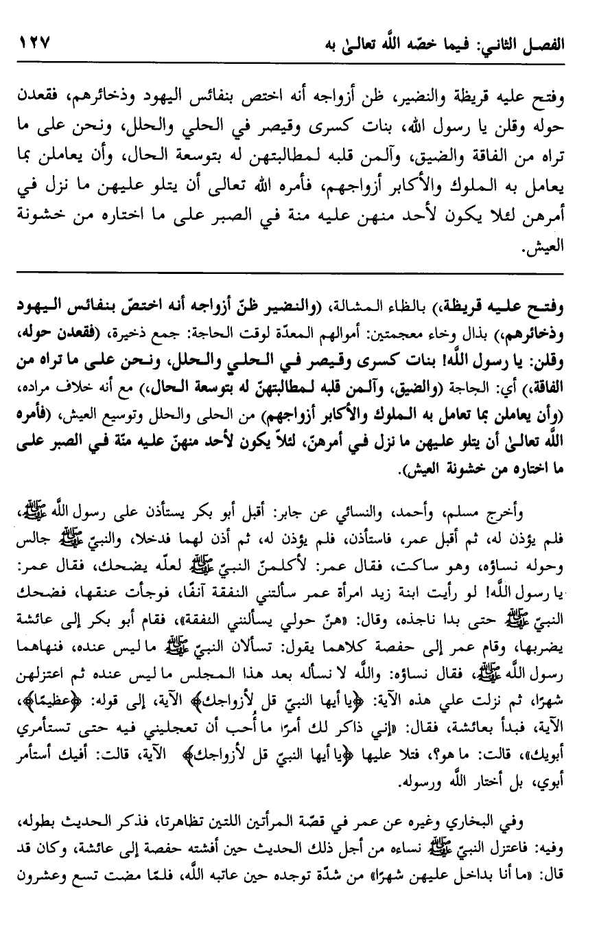 وفتح عليه قريظة والنضير، ظن أزواجه أنه اختص بنفائس اليهود وذخائرهم، فقعدن حوله وقلن يا رسول الله، بنات كسرى وقيصر في الحلي والحلل، ونحن على ما تراه من الفاقة والضيق، وآلمن قلبه لمطالبتهن له بتوسعة الحال، وأن يعاملن بما يعامل به الملوك والأكابر أزواجهم، فأمره الله تعالى أن يتلو عليهن ما نزل في أمرهن لئلا يكون لأحد منهن عليه منة في الصبر على ما اختاره من خشونة العيش.