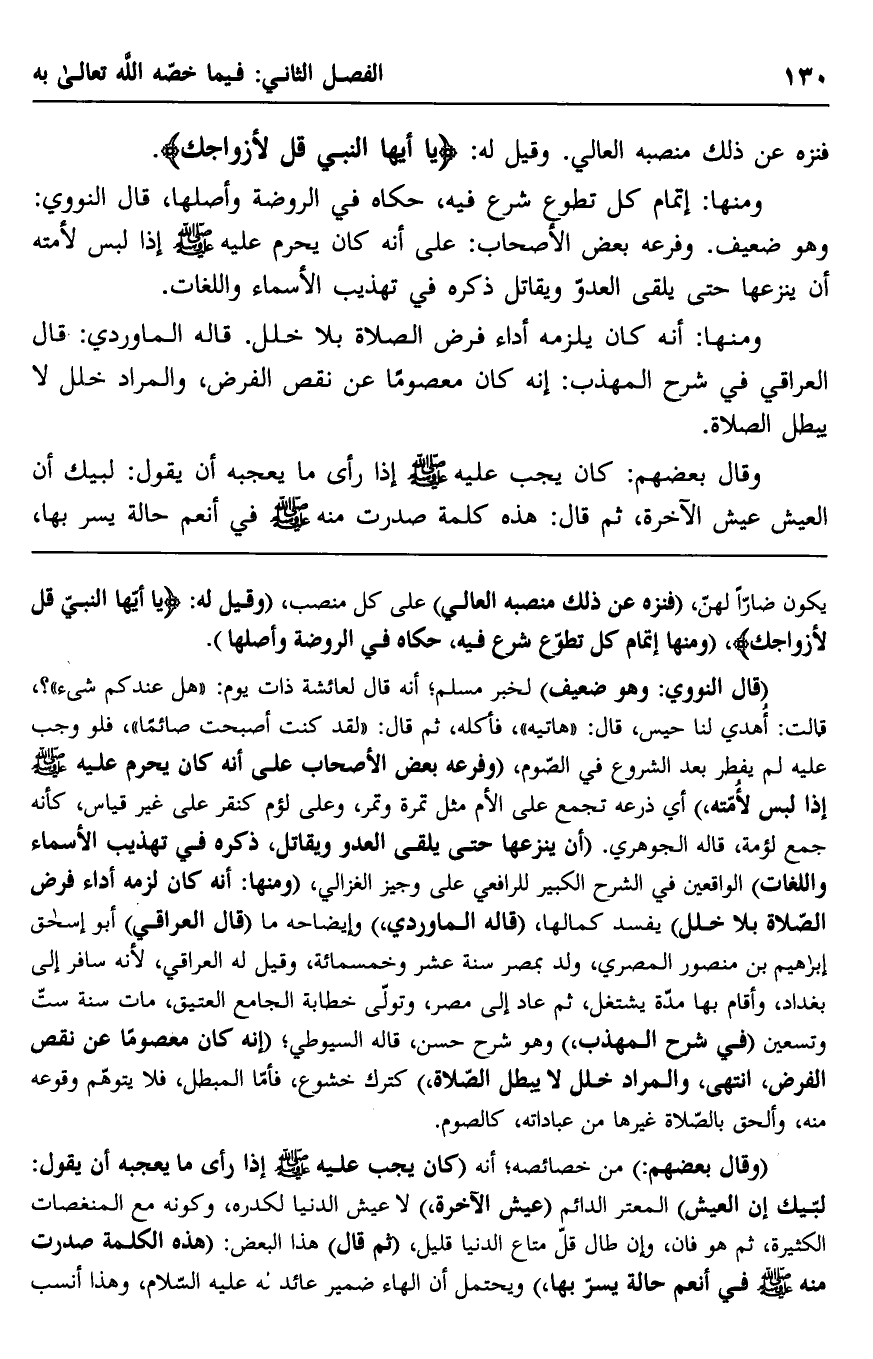 "قال النووي: وهو ضعيف" لخبر مسلم؛ أنه قال لعائشة ذات يوم: "هل عندكم شيء"؟. قالت: أهدي لنا حيس، قال: "هاتيه"، فأكله، ثم قال: "لقد كنت أصبحت صائمًا" فلو وجب عليه لم يفطر بعد الشروع في الصوم، "وفرعه بعض الأصحاب على أنه كان يحرم عليه صلى الل علي وسلم إذا لبس لأمته" أي: درعه, تجمع على لأم مثل تمرة وتمر، وعلى لؤم كنقر على غير قياس، كأنه جمع لؤمة، قاله الجوهري. "أن ينزعها حتى يلقى العدو ويقاتل، ذكره في تهذيب الأسماء واللغات" الواقعين في الشرح الكبير للرافعي على وجيز الغزالي، "ومنها: أنه كان لزمه أداء فرض الصلاة بلا خلل" يفسد كمالها، "قاله الماوردي" وإيضاحه ما "قال العراقي" أبو إسحاق إبراهيم بن منصور المصري، ولد بمصر سنة عشر وخمسمائة، وقيل له العراقي، لأنه سافر إلى بغداد، وأقام بها مدة يشتغل، ثم عاد إلى مصر، وتولى خطابة الجامع العتيق، مات سنة ست وتسعين "في شرح المهذب" وهو شرح حسن، قاله السيوطي؛ "إنه كان معصومًا عن نقص الفرض، انتهى، والمراد خلل لا يبطل الصلاة" كترك خشوع، فأما المبطل، فلا يتوهم وقوعه منه، وألحق بالصلاة غيرها من عباداته، كالصوم.