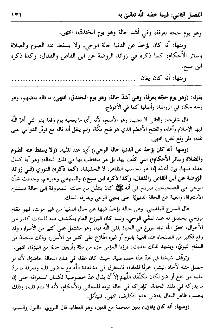 وتوقف شيخنا في عد هذا خصوصية، حيث كان عقله في تلك الحالة حاضرًا، لأنه لو حصل مثله لآحاد البشر، خرقًا للعادة، فاستغرق في مشاهدة الله مع حضور قلبه ومعرفة ما يرد عليه من نفع أو ضر لكان مكلفًا، اللهم إلا أن يقال عد خصوصية لكمال استغراقه حتى أن ما يدركه في تلك الحالة، كإدراكه في حالة نومه للمعاني والأحكام، لأنه لا ينام قلبه، وذلك بحسب ظاهر الحال يقتضي عدم التكليف، انتهى. فليتأمل.