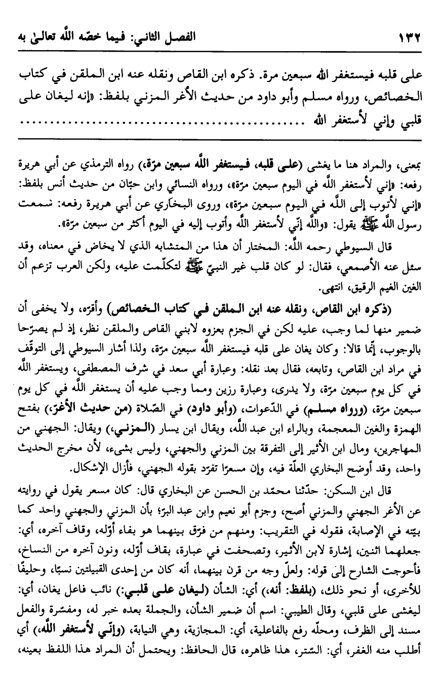 على قلبه فيستغفر الله سبعين مرة. ذكره ابن القاص ونقله عنه ابن الملقن في كتاب الخصائص، ورواه مسلم وأبو داود من حديث الأغر المزني بلفظ: "إنه ليغان على قلبي وإني لأستغفر الله