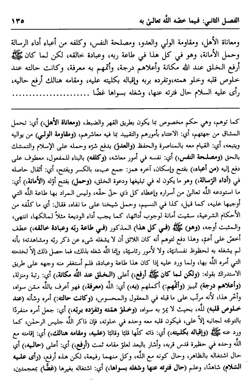 كما توهم، وهي حكم مخصوص بما يكون بطريق القهر والضبط، "ومعاناة الأهل" أي: تحمل المشاق من جهتهم، أي: الاعتناء بأمورهم والتقييد بما فيه معاشرهم, "ومقاومة الولي" من يواليه ويتبعه، أي: القيام معه بالمناصرة والحفظ "والعدو" بدفع شره وحمله على الإسلام والتمسك بالحق "ومصلحة النفس" أي: نفسه في أمور معاشه، "وكلفه" بالبناء للمفعول، معطوف على دفع إليه "من أعباء" بفتح وإسكان، آخره همز: جمع عبء، بالكسر ويفتح، أي: أثقال حاصله في "أداء الرسالة" وهو ما يكون له في تبليغها ودعوة الخلق، "وحمل" بفتح أوله "الأمانة" أي: ما استودعه الله تعالى من أسراره وإعطاء كل ذي حق حقه، وليس المراد بها طاعة الله التي أوجبها عليه، كما قيل: كذا في النسيم، وحمل شيخنا على ما نفاه، فقال: أي ما كلفه من الأحكام الشرعية، سميت أمانة لوجوب أدائها، كما يجب أاء الوديعة مثلا لمالكها، انتهى، والمثبت أوجه، "وهو" صلى الله عليه وسلم "في كل هذا" المذكور "في طاعة ربه وعبادة خالقه" عطف أخص على أعم، وهذا دفع لتوهم أنه كان اللائق أن لا يشغله شيء عن ذكر ربه ومشاهدته؛ بأنه لم يشغله به لحظوظ نفسانية، ولا لأمور رئاسية، وإنما الله شغله بذلك، فما حصل ذلك إلا لخدمته التي أمره الله بها، ولما ورد عليه إن كان هذا طاعة وعبادة، فلم استغفر منه وجهه على طريق الاستدراك بقوله: "ولكن لما كان صلى الله عليه وسلم أرفع" أعلى "الخلق عند الله مكانة" أي: رتبة ومنزلة، "وأعلاهم درجة" تمييز "وأتمهم" أكملهم "به" أي: الله "معرفة" فهو أعرف بالله ممن سواه، وآخر هذا، لأنه مرتب على ما قبله في المعقول والمحسوس، "وكانت حالته" أمره وشأنه "عند خلوص قلبه" لله، بحيث لا يمر به سواه، "وخلو همته وتفرده بربه" أي: جعل أمره منفردًا بالتوجه لجانبه الأعلى، فيكون قلبه معه وحده في خلوته، فإن ذاكر الله جليس الرحمن، كما ورد عنه صلى الله عليه وسلم "وإقباله بكليته" أي: ذاته كلها قلبًا وقالبًا "عليه، ومقامه هنالك" أي: إقامته مع الله وحده في حظيرة قدس قربه، وأشار بالبعد لعلو مقامه ثمة "أرفع" أي: أعلى "حاليه" أي حال اشتغاله بالظاهر، وحال كونه مع الله، وكل منهما رفيعة، لكن هذه أرفع، "رأى عليه السلام" شاهدًا، وعلم "حال فترته عنها وشغله بسواها" أي: اشتغاله بغيرها "غضًا بمعجمتين،