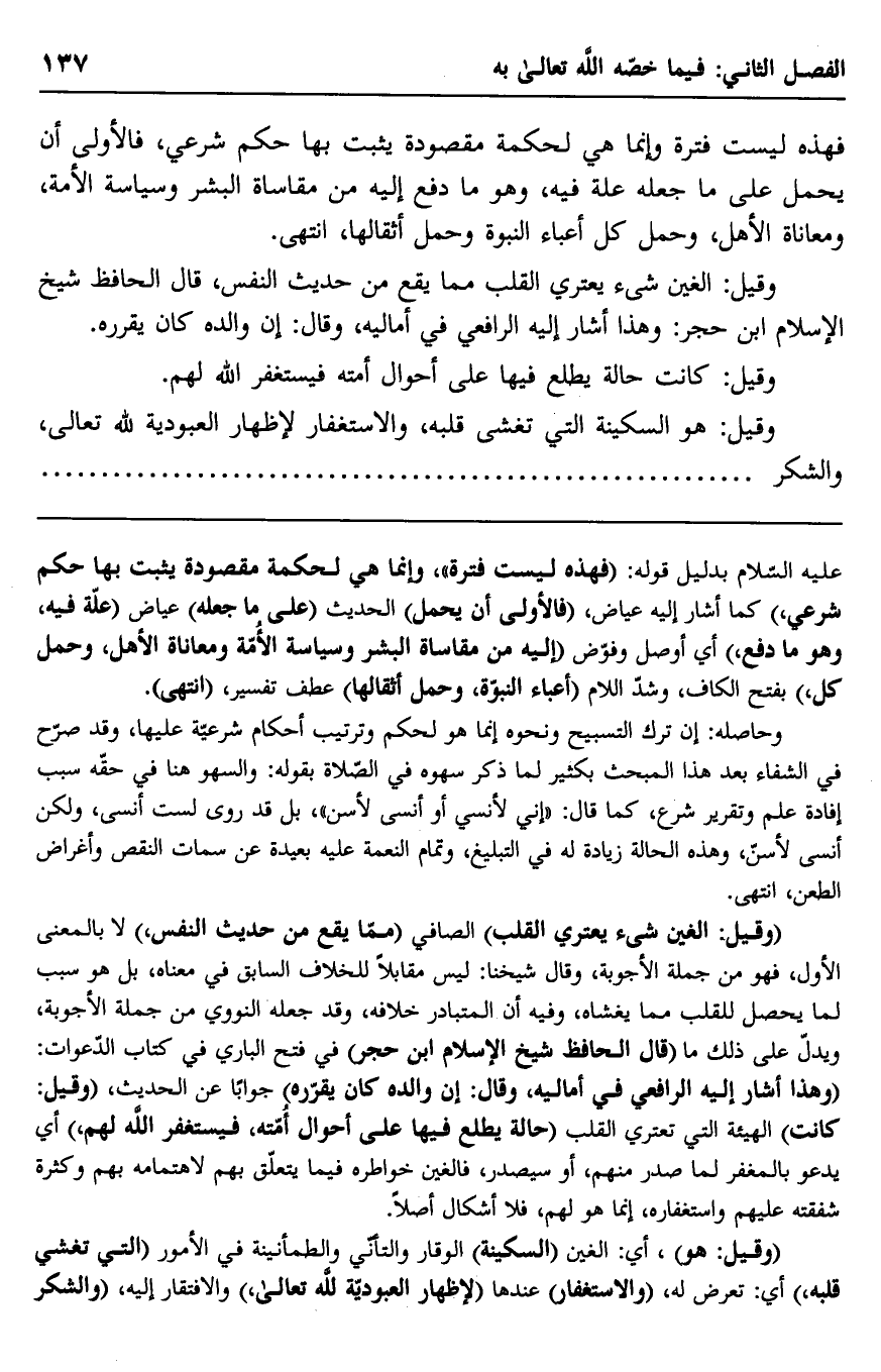 وحاصله: إن ترك التسبيح ونحوه إنما هو لحكم وترتيب أحكام شرعية عليها، وقد صرح في الشفاء بعد هذا المبحث بكثير لما ذكر سهوه في الصلاة بقوله: والسهو هنا في حقه سبب إفادة علم وتقرير شرع، كما قال: "إني لأنسى أو أُنسَّى لأسن". بل قد روي: "لست أنسى، ولكن أنسى لأسن"، وهذه الحالة زيادة له في التبليغ، وتمام النعمة عليه بعيدة عن سمات النقص وأغراض الطعن، انتهى.