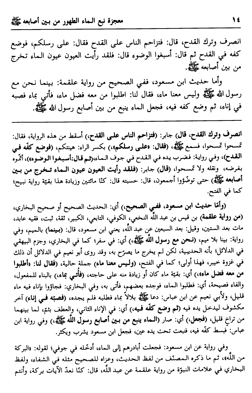 وأما حديث ابن مسعود، ففي الصحيح من رواية علقمة: بينما نحن مع رسول الله صلى الله عليه وسلم وليس معنا ماء، فقال لنا: "اطلبوا من معه فضل ماء". فأتي بماء فصبه في إناء، ثم وضع كفه فيه، فجعل الماء ينبع من بين أصابع رسول الله صلى الله عليه وسلم.