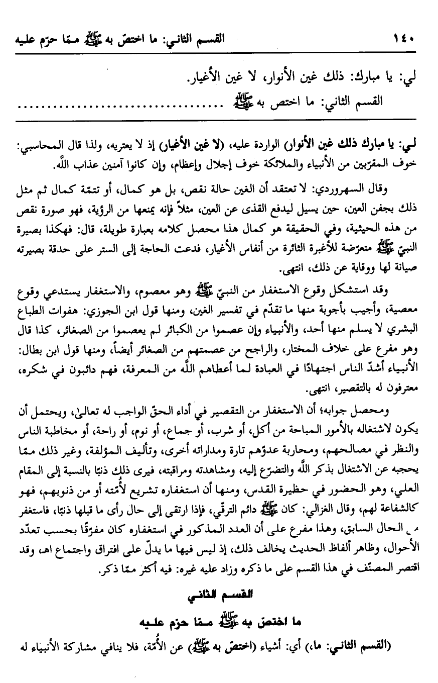 ومحصل جوابه؛ أن الاستغفار من التقصير في أداء الحق الواجب له تعالى، ويحتمل أن يكون لاشتغاله بالأمور المباحة من أكل، أو شرب، أو جماع، أو نوم، أو راحة، أو مخاطبة الناس والنظر في مصالحهم، ومحاربة عدوهم تارة ومداراته أخرى، وتأليف المؤلفة، وغير ذلك مما يحجبه عن الاشتغال بذكر الله والتضرع إليه، ومشاهدته ومراقبته، فيرى ذلك ذنبًا بالنسبة إلى المقام العلي، وهو الحضور في حظيرة القدس، ومنها أن استغفاره تشريع لأمته أو من ذنوبهم، فهو كالشفاعة لهم، وقال الغزالي: كان صلى الله عليه وسلم دائم الترقي، فإذا ارتقى إلى حال رأى ما قبلها ذنبًا، فاستغفر من احال السابق، وهذا مفرع على أن العدد المذكور في استغفاره كان مفرقًا بحسب تعدد الأحوال، وظاهر ألفاظ الحديث يخالف ذلك، إذ ليس فيها ما يدل على افتراق واجتماع. ا. هـ. وقد اقتصر المصنف في هذا القسم على ما ذكره وزاد عليه غيره فيه أكثر مما ذكر.