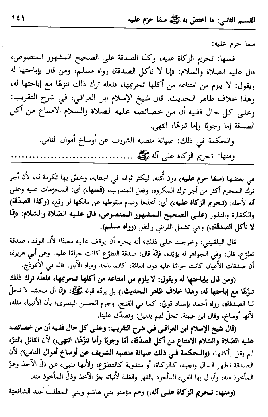 فمنها: تحريم الزكاة عليه، وكذا الصدقة على الصحيح المشهور المنصوص، قال عليه الصلاة والسلام: "إنا لا نأكل الصدقة" رواه مسلم، ومن قال بإباحتها له ويقول: لا يلزم من امتناعه من أكلها تحريمها، فلعله ترك ذلك تنزهًا مع إباحتها له، وهذا خلاف ظاهر الحديث. قال شيخ الإسلام ابن العراقي، في شرح التقريب: وعلى كل حال ففيه أن من خصائصه عليه الصلاة والسلام الامتناع من أكل الصدقة إما وجوبًا وإما تنزهًا، انتهى.