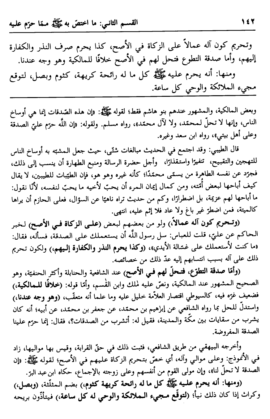 وبعض المالكية، والمشهور عندهم بنو هاشم فقط؛ لقوله صلى الله عليه وسلم: "إن هذه الصدقات إنما هي أوساخ الناس، وإنها لا تحل لمحمد، ولا لآل محمد" رواه مسلم، ولقوله: "إن الله حرم عليّ الصدقة وعلى أهل بيتي"، رواه ابن سعد وغيره.