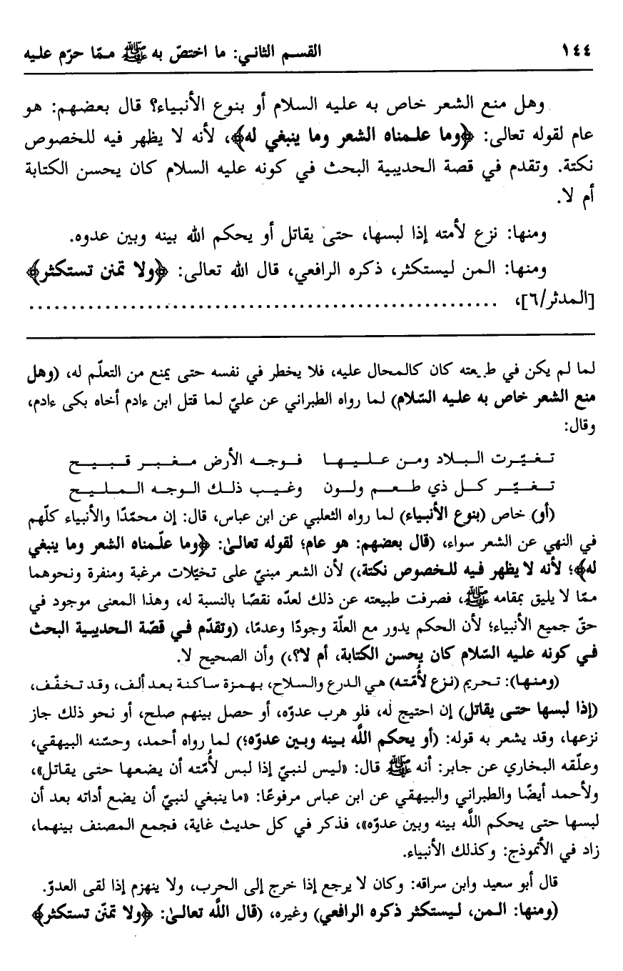 وهل منع الشعر خاص به عليه السلام أو بنوع الأنبياء؟ قال بعضهم: هو عام لقوله تعالى: {وَمَا عَلَّمْنَاهُ الشِّعْرَ وَمَا يَنْبَغِي لَهُ} ، لأنه لا يظهر فيه للخصوص نكتة. وتقدم في قصة الحديبية البحث في كونه عليه السلام كان يحسن الكتابة أم لا.