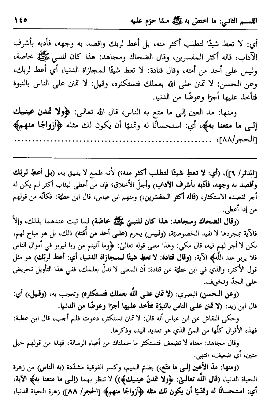 "وقال الضحاك ومجاهد: هذا كان للنبي صلى الله عليه وسلم خاصة" لما ثبت عندهما بذلك، وإلا فالآية بمجردها لا تفيد الخصوصية، "وليس" يحرم "على أحد من أمته" ذلك، بل هو مباح لهم، لكن لا أجر لهم فيه، قال مكي: وهذا معنى قوله تعالى: {وَمَا آتَيْتُمْ مِنْ رِبًا لِيَرْبُوَ فِي أَمْوَالِ النَّاسِ فَلَا يَرْبُو عِنْدَ اللَّهِ} الآية، "وقال قتادة: لا تعط شيئًا لمجازاة الدنيا، أي: أعط لربك" هو مثل قول الأكثر، والذي في ابن عطية عن قتادة: أن المعنى لا تدل بعلمك، ففي هذا التأويل تحريض على الجد وتخويف.
