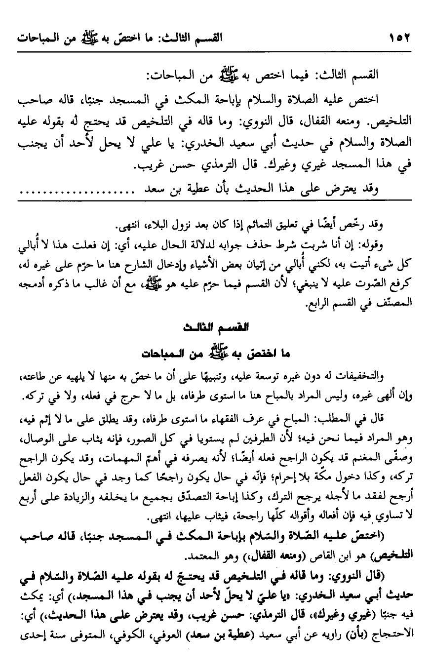 اختص عليه الصلاة والسلام بإباحة المكث في المسجد جنبًا، قال صاحب التلخيص, ومنعه القفال، قال النووي: وما قاله في التلخيص قد يحتج له بقوله عليه الصلاة والسلام في حديث أبي سعيد الخدري: "يا علي لا يحل لأحد أن يجنب في هذا المسجد غيري وغيرك". قال الترمذي حسن غريب.