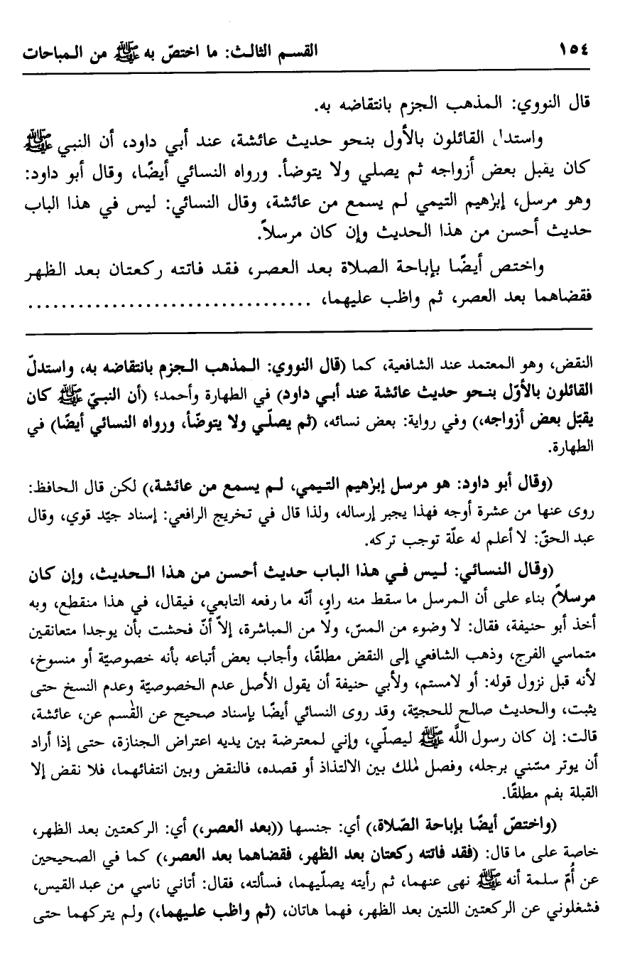 واستدل القائلون بالأول بنحو حديث عائشة، عند أبي داود، أن النبي صلى الله عليه وسلم كان يقبل بعض أزواجه ثم يصلي ولا يتوضأ. ورواه النسائي أيضًا، وقال أبو داود: وهو مرسل، إبراهيم التيمي لم يسمع من عائشة، وقال النسائي: ليس في هذا الباب حديث أحسن من هذا الحديث وإن كان مرسلا.