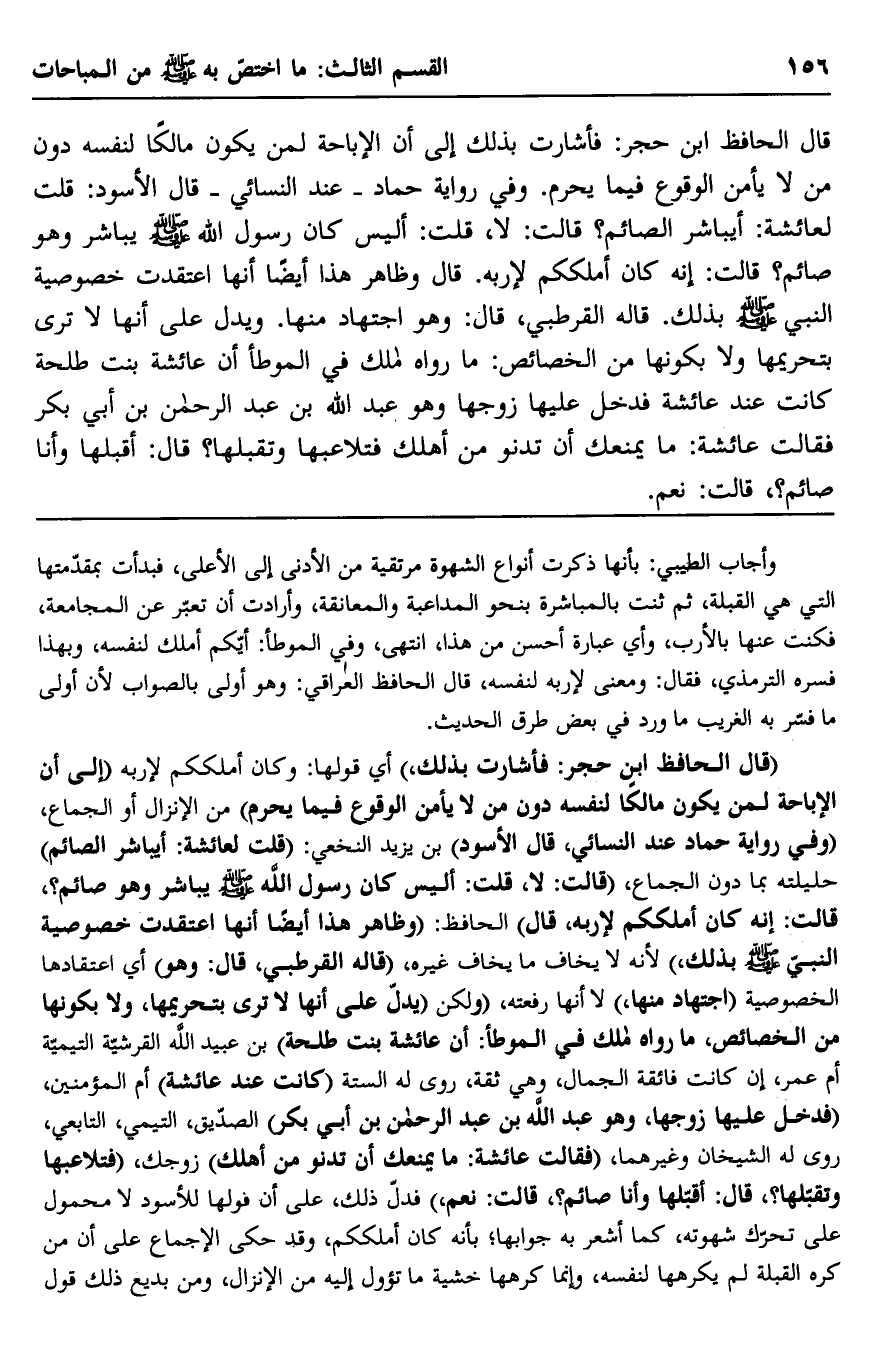 قال الحافظ ابن حجر: فأشارت بذلك إلى أن الإباحة لمن يكون مالكًا لنفسه دون من لا يأمن الوقوع فيما يحرم. وفي رواية حماد -عند النسائي- قال الأسود: قلت لعائشة: أيباشر الصائم؟ قالت: لا، قلت: أليس كان رسول الله صلى الله عليه وسلم يباشر وهو صائم؟ قالت: إنه كان أملككم لإربه. قال وظاهر هذا أيضًا أنها اعتقدت خصوصية النبي صلى الله عليه وسلم بذلك. قاله القرطبي، قال: وهو اجتهاد منها. ويدل على أنها لا ترى بتحريمها ولا بكونها من الخصائص: ما رواه مالك في الموطأ أن عائشة بنت طلحة كانت عند عائشة فدخل عليها زوجها وهو عبد الله بن عبد الرحمن بن أبي بكر فقالت عائشة: ما يمنعك أن تدنو من أهلك فتلاعبها وتقبلها؟ قال: أقبلها وأنا صائم؟ قالت: نعم.