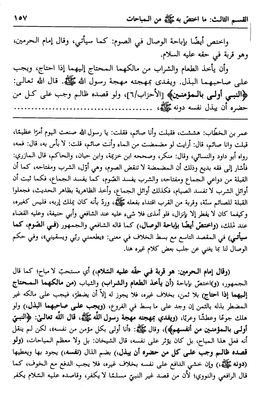 "وقال إمام الحرمين: هو قربة في حقه عليه السلام" أي مستحب لا مباح؛ كما قال الجمهور، "و" اختص بإباحة "أن يأخذ الطعام والشراب" والثياب "من مالكهما المحتاج إليهما إذا احتاج" بلا ثمن، بخلاف غيره، فلا يجوز له إلا أن يضطر، فيجب على مالكه غير المضطر بذله بالثمن إن وجد على ما بسط في الفروع، "ويجب على صاحبهما البذل" ولو هلك جوعًا وعطشًا وعريًا، "ويفدي بمهجته مهجة رسول الله صلى الله عليه وسلم، قال الله تعالى: {النَّبِيُّ أَوْلَى بِالْمُؤْمِنِينَ مِنْ أَنْفُسِهِمْ} ، وقال صلى الله عليه وسلم: "أنا أولى بكل مؤمن من نفسه"، لكن لم ينقل أنه فعل هذا المباح، بل كان يؤثر على نفسه، قال الشيخان: بل ولا معظم المباحات، "ولو قصده ظالم وجب على كل من حضره أن يبذل" بضم الذال "نفسه" يجود بها ويعطيها "دونه صلى الله عليه وسلم" وإن خشي الدافع على نفسه بخلاف غيره، فلا يجب الدفع مع الخوف، كما قال الرافعي والنووي؛ لأن من قصد غير النبي مسلمًا لا يكفر، وقاصده عليه السلام يكفر