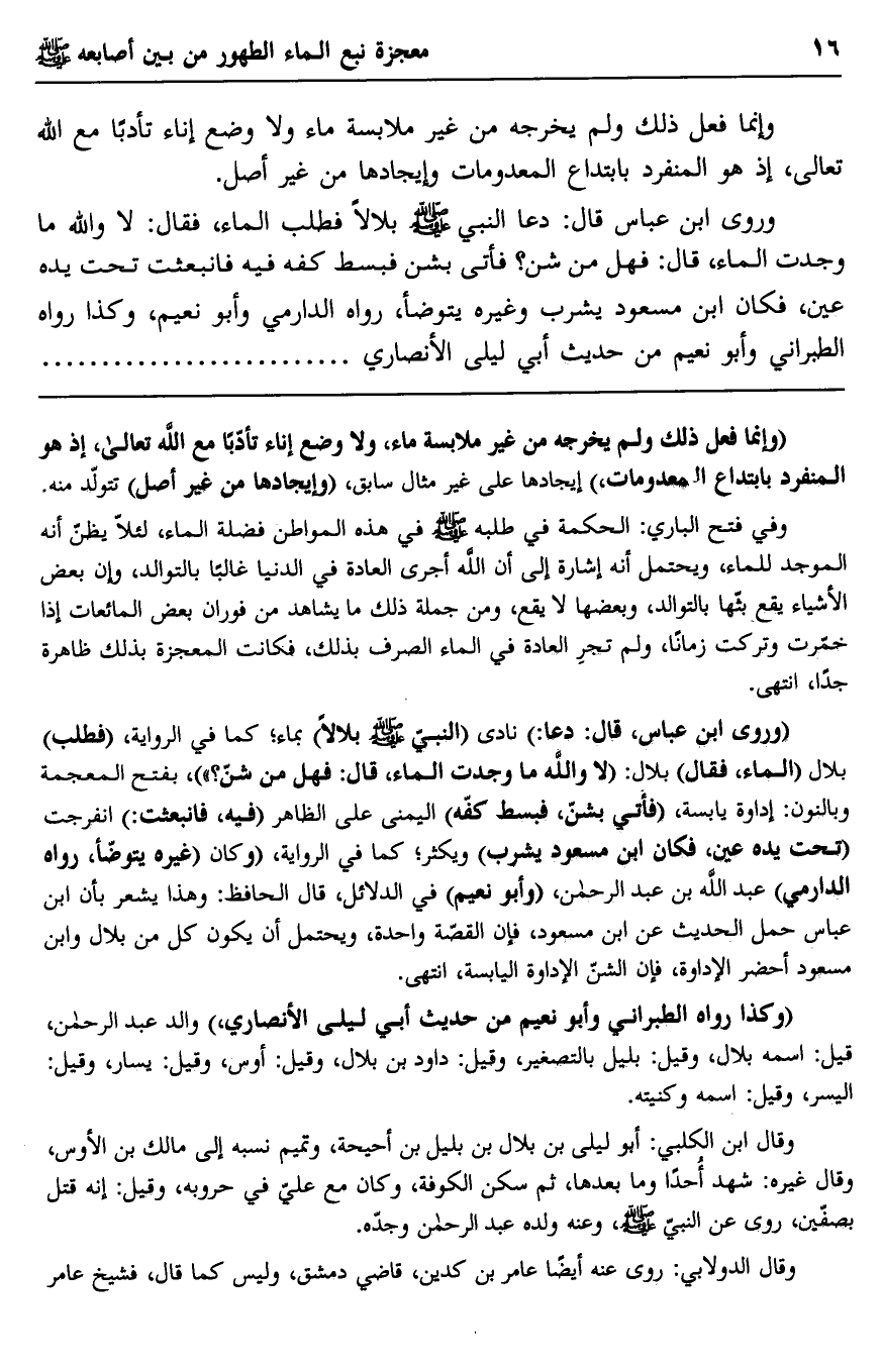 وروى ابن عباس قال: دعا النبي صلى الله عليه وسلم بلالا فطلب الماء، فقال: لا والله ما وجدت الماء، قال: "فهل من شن"؟. فأتي بشن فبسط كفه فيه فانبعثت تحت يده عين، فكان ابن مسعود يشرب وغيره يتوضأ، رواه الدارمي وأبو نعيم، وكذا رواه الطبراني وأبو نعيم من حديث أبي ليلى الأنصاري وأبو نعيم من طريق القاسم بن عبد الله بن أبي رافع عن أبيه عن جده.