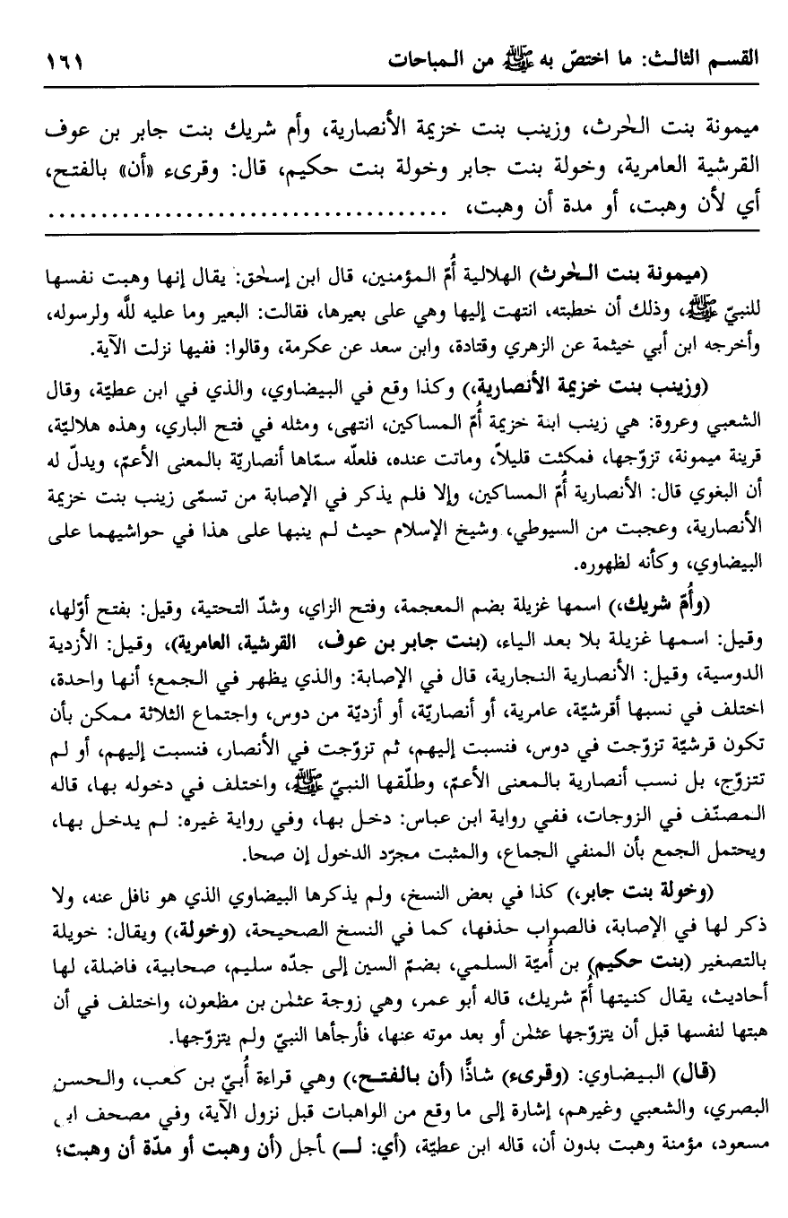 "وخولة بنت جابر" كذا في بعض النسخ، ولم يذكرها البيضاوي الذي هو نافل عنه، ولا ذكر لها في الإصابة، فالصواب حذفها، كما في النسخ الصحيحة، "وخولة" ويقال: خويلة بالتصغير"بنت حكيم" بن أمية السلمي، بضم السين إلى جده سليم، صحابية، فاضلة، لها أحاديث، يقال كنيتها أم شريك، قاله أبو عمر، وهي زوجة عثمان بن مظعون، واختلف في أن هبتها لنفسها قبل أن يتزوجها عثمان أو بعد موته عنها، فأرجأها النبي ولم يتزوجها.