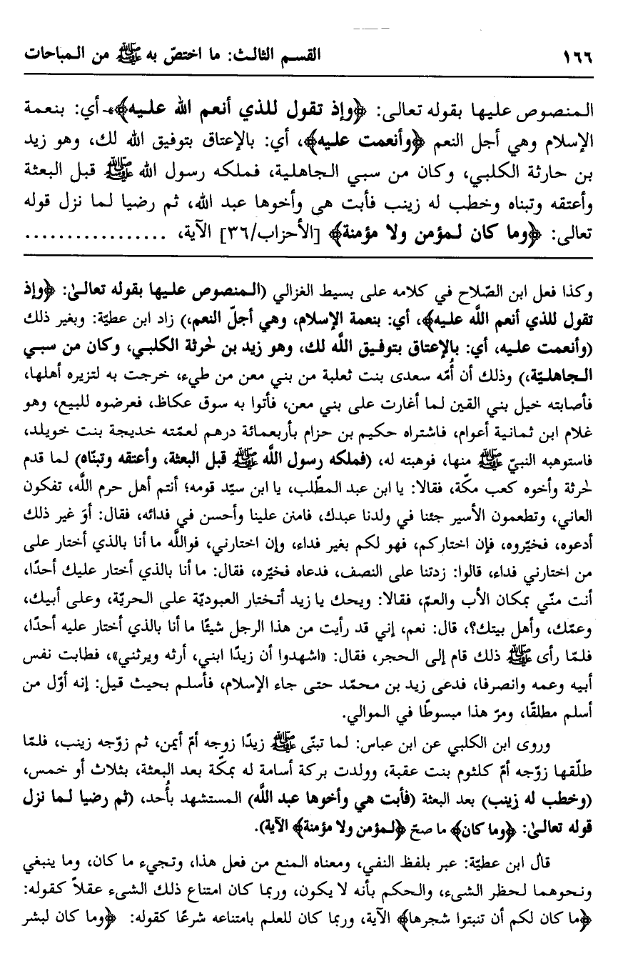 وكذا فعل ابن الصلاح في كلامه على بسيط الغزالي "المنصوص عليها بقوله تعالى: {وَإِذْ تَقُولُ لِلَّذِي أَنْعَمَ اللَّهُ عَلَيْهِ} أي: بنعمة الإسلام وهي أجل النعم" زاد ابن عطية: وبغير ذلك "وأنعمت عليه، أي: بالإعتاق بتوفيق الله لك، وهو زيد بن حارثة الكلبي، وكان من سبي الجاهلية" وذلك أن أمه سعدى بنت ثعلبة من بني معن من طيئ، خرجت به لتزيره أهلها، فأصابته خيل بني القين لما أغارت على بني معن، فأتوا به سوق عكاظ، فعرضوه للبيع، وهو غلام ابن ثمانية أعوام، فاشتراه حكيم بن حزام بأربعمائة درهم لعمته خديجة بنت خويلد، فاستوهبه النبي صلى الله عليه وسلم منها، فوهبته له، "فملكه رسول الله صلى الله عليه وسلم قبل البعثة، وأعتقه وتبناه" لما قدم حارثة وأخوه كعب مكة، فقالا: يابن عبد المطلب، يابن سيد قومه؛ أنتم أهل حرم الله، تفكون العاني، وتطعمون الأسير جئنا في ولدنا عبدك، فامنن علينا وأحسن في فدائه، فقال: "أو غير ذلك أدعوه، فخيروه، فإن اختاركم، فهو لكم بغير فداء، وإن اختارني، فوالله ما أنا بالذي أختار على من اختارني فداء". قالوا: زدتنا على النصف، فدعاه فخيره، فقال: ما أنا بالذي أختار عليك أحدًا، أنت مني بمكان الأب والعم، فقالا: ويحك يا زيد أتختار العبودية على الحرية، وعلى أبيك، وعمك، وأهل بيتك؟ قال: نعم، إني قد رأيت من هذا الرجل شيئًا ما أنا بالذي أختار عليه أحدًا، فلما رأى صلى الله عليه وسلم ذلك قام إلى الحجر، فقال: "اشهدوا أن زيدًا ابني، أرثه ويرثني"، فطابت نفس أبيه وعمه وانصرفا، فدعي زيد بن محمد حتى جاء الإسلام، فأسلم بحيث قيل: إنه أول من أسلم مطلقًا، ومر هذا مبسوطًا في الموالي.