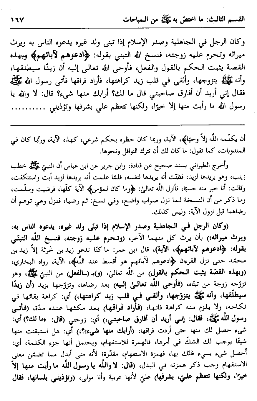 وكان الرجل في الجاهلية وصدر الإسلام إذا تبنى ولد غيره يدعوه الناس به ويرث ميراثه وتحرم عليه زوجته، فنسخ الله التبني بقوله: {ادْعُوهُمْ لِآبَائِهِمْ} وبهذه القصة يثبت الحكم بالقول والفعل، فأوحى الله تعالى إليه أن زيدًا سيطلقها، وأنه صلى الله عليه وسلم يتزوجها، وألقى في قلب زيد كراهتها، فأراد فراقها فأتى رسول الله صلى الله عليه وسلم فقال: إني أريد أن أفارق صاحبتي قال: "ما لك؟ أرابك منها شيء"؟. قال: لا والله يا رسول الله! ما رأيت منها إلا خيرًا، ولكنها تتعظم عليّ بشرفها وتؤذيني.