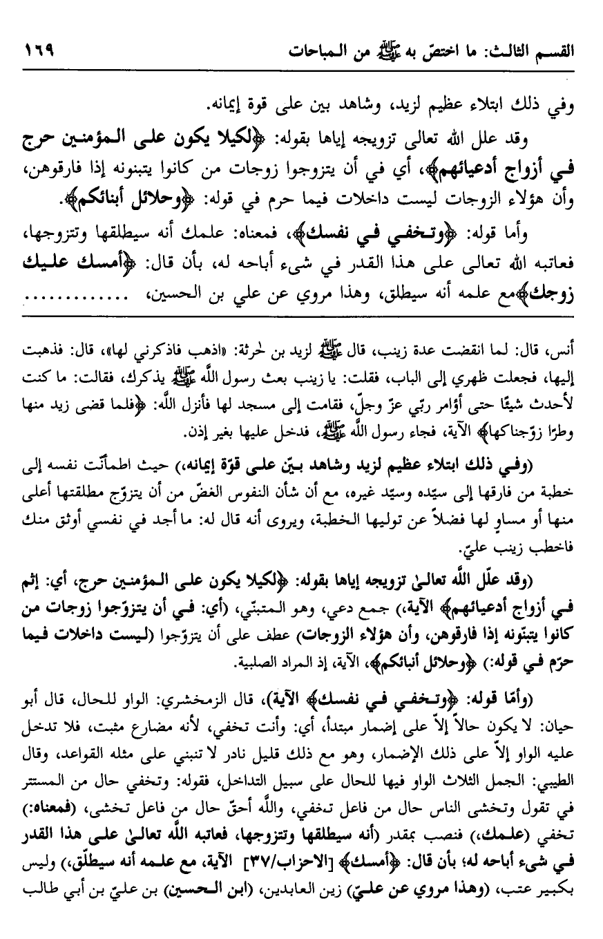 "وأما قوله: {وَتُخْفِي فِي نَفْسِكَ} الآية، قال الزمخشري: الواو للحال، قال أبو حيان: لا يكون حالا إلا على إضمار مبتدأ، أي: وأنت تخفي، لأنه مضارع مثبت، فلا تدخل عليه الواو إلا على ذلك الإضمار، وهو مع ذلك قليل نادر لا تنبني على مثله القواعد، وقال الطيبي: الجمل الثلاث الواو فيها للحال على سبيل التداخل، فقوله: {وَتُخْفِي} حال من المستتر في {تَقُولُ} و {وَتَخْشَى النَّاسَ} حال من فاعل تخفي، {وَاللَّهُ أَحَقُّ} حال من فاعل تخشى، "فمعناه" تخفي "علمك" فنصب بمقدر "أنه سيطلقها وتتزوجها، فعاتبه الله تعالى على هذا القدر في شيء أباحه له؛ بأن قال: {أَمْسَكْ} [الأحزاب: 37] الآية، مع علمه أنه سيطلق" وليس بكبير عتب، "وهذا مروي عن علي" زين العابدين، "ابن الحسين" بن علي بن أبي طالب