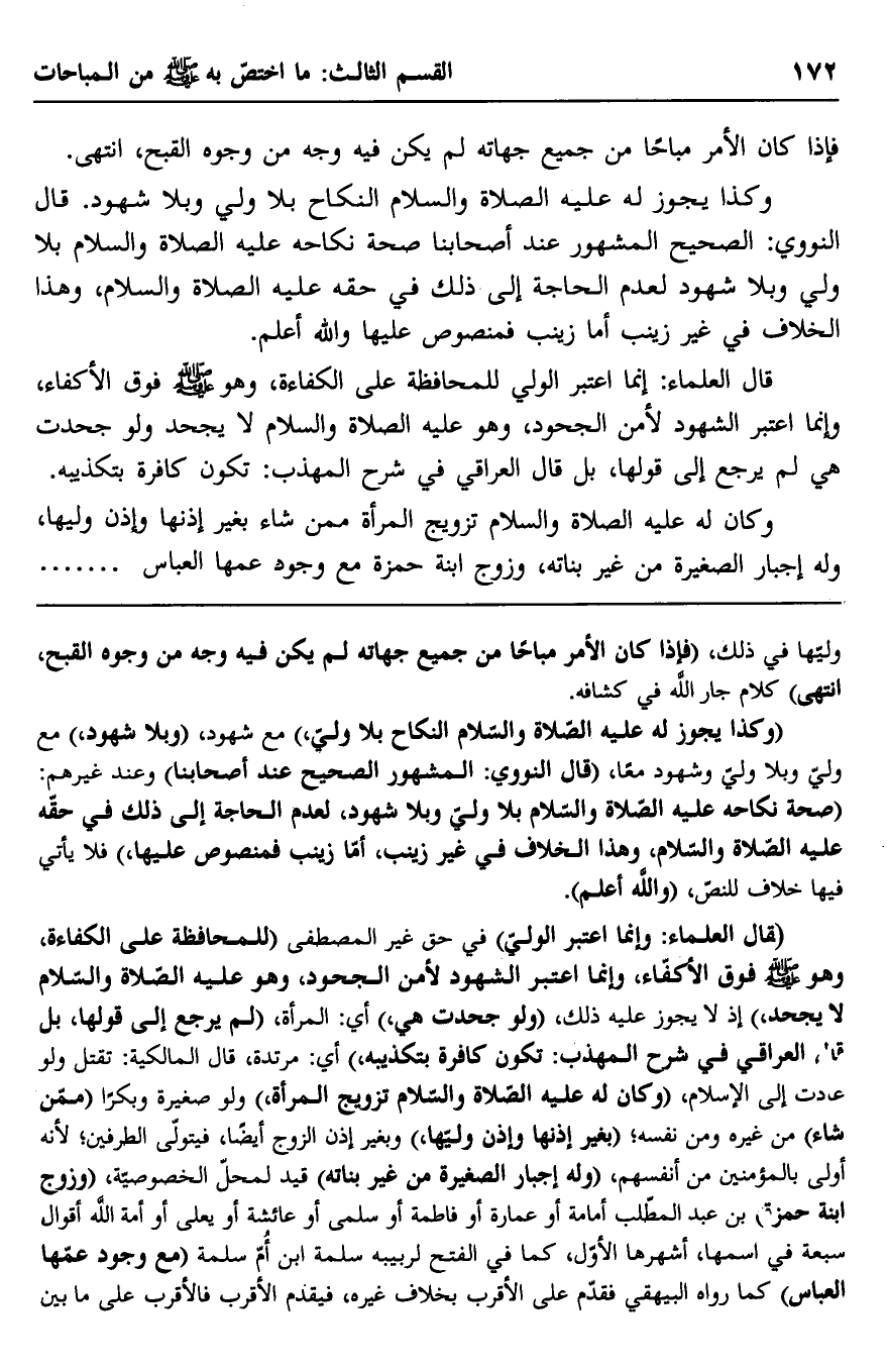 وكذا يجوز له عليه الصلاة والسلام النكاح بلا ولي وبلا شهود. قال النووي: الصحيح المشهور عند أصحابنا صحة نكاحه عليه الصلاة والسلام بلا ولي وبلا شهود لعدم الحاجة إلى ذلك في حقه عليه الصلاة والسلام، وهذا الخلاف في غير زينب أما زينب فمنصوص عليها والله أعلم.