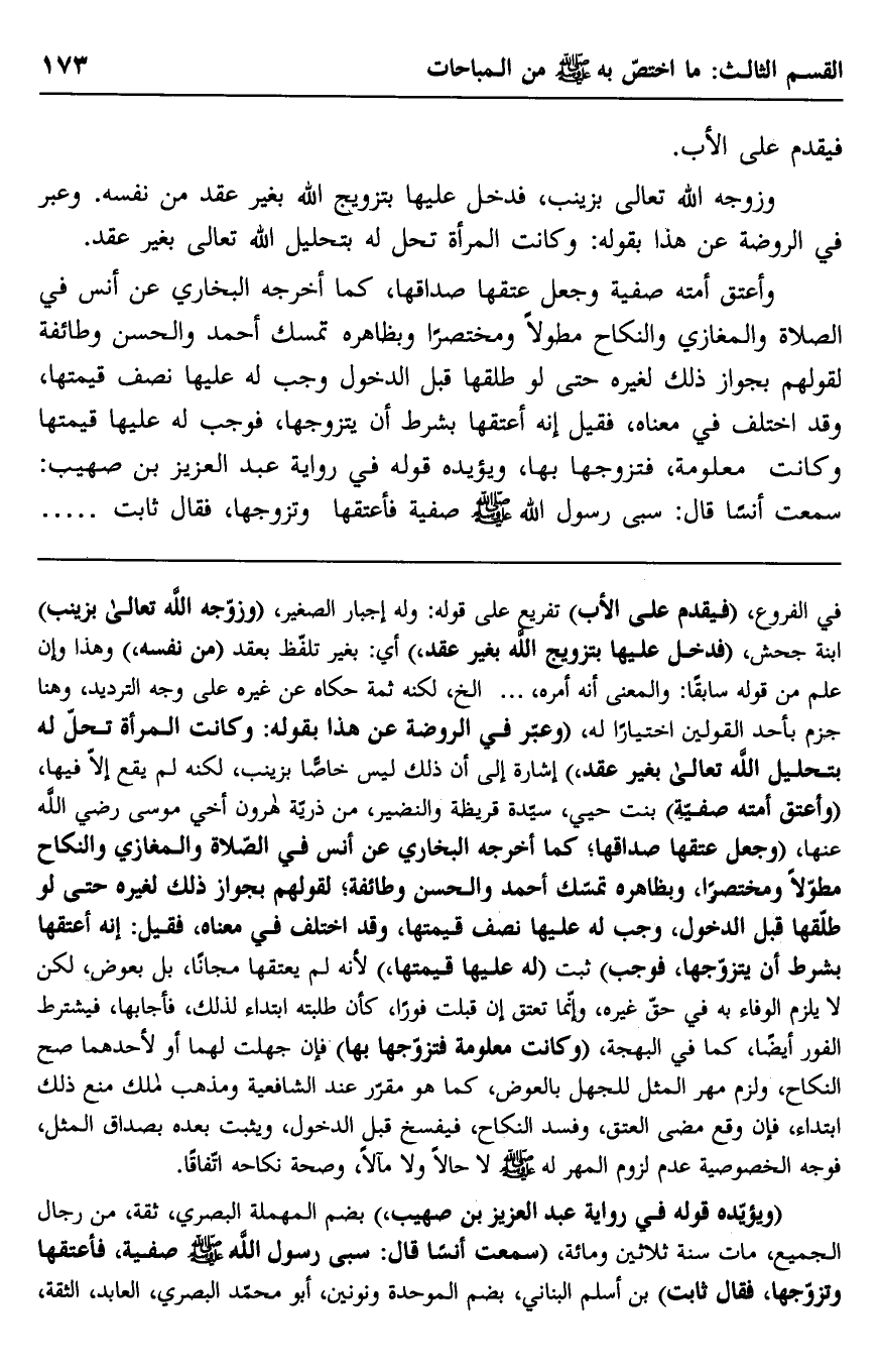 وزوجه الله تعالى بزينب، فدخل عليها بتزويج الله بغير عقد من نفسه. وعبر في الروضة عن هذا بقوله: وكانت المرأة تحل له بتحليل الله تعالى بغير عقد.