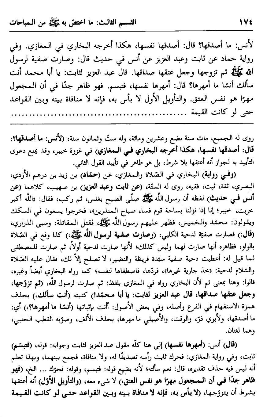 لأنس: ما أصدقها؟ قال: أصدقها نفسها، هكذا أخرجه البخاري في المغازي. وفي رواية حماد عن ثابت وعبد العزيز عن أنس في حديث قال: وصارت صفية لرسول الله صلى الله عليه وسلم ثم تزوجها وجعل عتقها صداقها. قال عبد العزيز لثابت: يا أبا محمد أنت سألك أنسًا ما أمهرها؟ قال: أمهرها نفسها، فتبسم. فهو ظاهر جدًا في أن المجعول مهرًا هو نفس العتق. والتأويل الأول لا بأس به، فإنه لا منافاة بينه وبين القواعد حتى لو كانت القيمة.