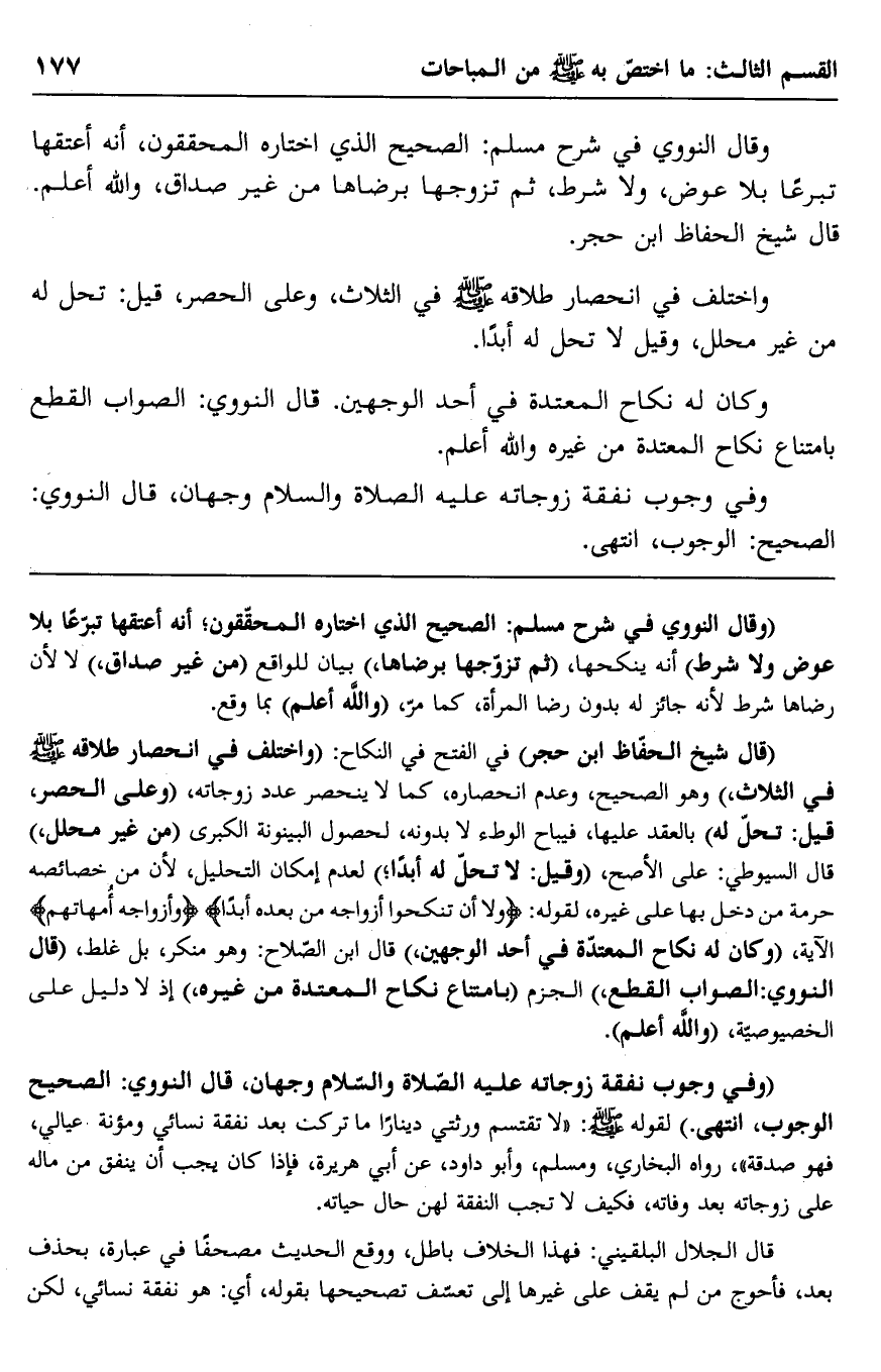 "قال شيخ الحافظ ابن حجر" في الفتح في النكاح: "واختلف في انحصار طلاقه صلى الله عليه وسلم في الثلاث" وهو الصحيح، وعدم انحصاره، كما لا ينحصر عدد زوجاته، "وعلى الحصر، قيل: تحل له" بالعقد عليها، فيباح الوطء لا بدونه، لحصول البينونة الكبرى "من غير محلل" قال السيوطي: على الأصح، "وقيل: لا تحل له أبدًا" لعدم إمكان التحليل، لأن من خصائصه حرمة من دخل بها على غيره، لقوله: {وَلا أَنْ تَنْكِحُوا أَزْوَاجَهُ مِنْ بَعْدِهِ أَبَدًا} {وَأَزْوَاجُهُ أُمَّهَاتُهُمْ} الآية، "وكان له نكاح المعتدة في أحد الوجهين" قال في الصلاح: وهو منكر، بل غلط، "قال النووي: الصواب القطع" الجزم "بامتناع نكاح المعتدة من غيره" إذ لا دليل على الخصوصية، "والله أعلم".