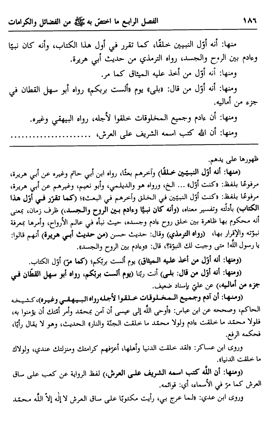 "منها: أنه أول النبيين خلقًا" وآخرهم بعثًا، رواه ابن أبي حاتم وغيره عن أبي هريرة، مرفوعًا بلفظ: "كنت أول" ... إلخ، ورواه هو والديلمي، وأبو نعيم، وغيرهم عن أبي هريرة، مرفوعًا بلفظ: "كنت أول النبيين في الخلق وآخرهم في البعث"؛ "كما تقرر في أول هذا الكتاب" بأدلته وتفسير معناه، "وأنه كان نبيًا وآدم بين الروح والجسد" ظرف زمان، بمعنى أنه محكوم بها ظاهرة بين خلق روح آدم وجسده، حيث نبأه في عالم الأرواح، وأمرها بمعرفة نبوته والإقرار بها، "رواه الترمذي" وقال: حديث حسن "من حديث أبي هريرة" أنهم قالوا: يا رسول الله! متى وجبت لك النبوة؟ قال: "وآدم بين الروح والجسد".