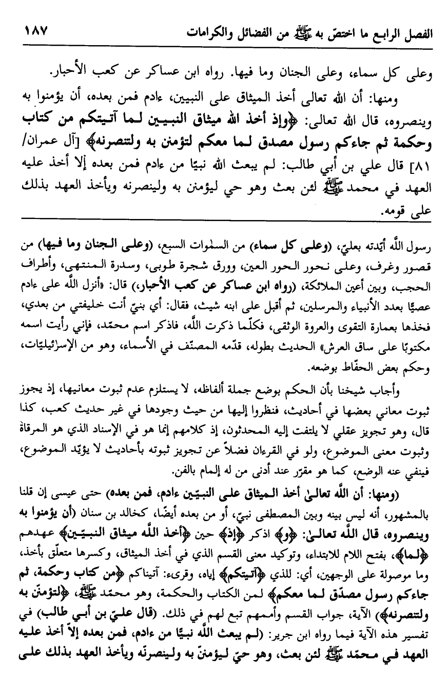 ومنها: أن الله تعالى أخذ الميثاق على النبيين، آدم فمن بعده، أن يؤمنوا به وينصروه، قال الله تعالى: {وَإِذْ أَخَذَ اللَّهُ مِيثَاقَ النَّبِيِّينَ لَمَا آتَيْتُكُمْ مِنْ كِتَابٍ وَحِكْمَةٍ ثُمَّ جَاءَكُمْ رَسُولٌ مُصَدِّقٌ لِمَا مَعَكُمْ لَتُؤْمِنُنَّ بِهِ وَلَتَنْصُرُنَّهُ} [آل عمران: 81] قال علي بن أبي طالب: لم يبعث الله نبيًا من آدم فمن بعده إلا أخذ عليه العهد في محمد صلى الله عليه وسلم لئن بعث وهو حي ليؤمنن به ولينصرنه ويأخذ العهد بذلك على قومه.