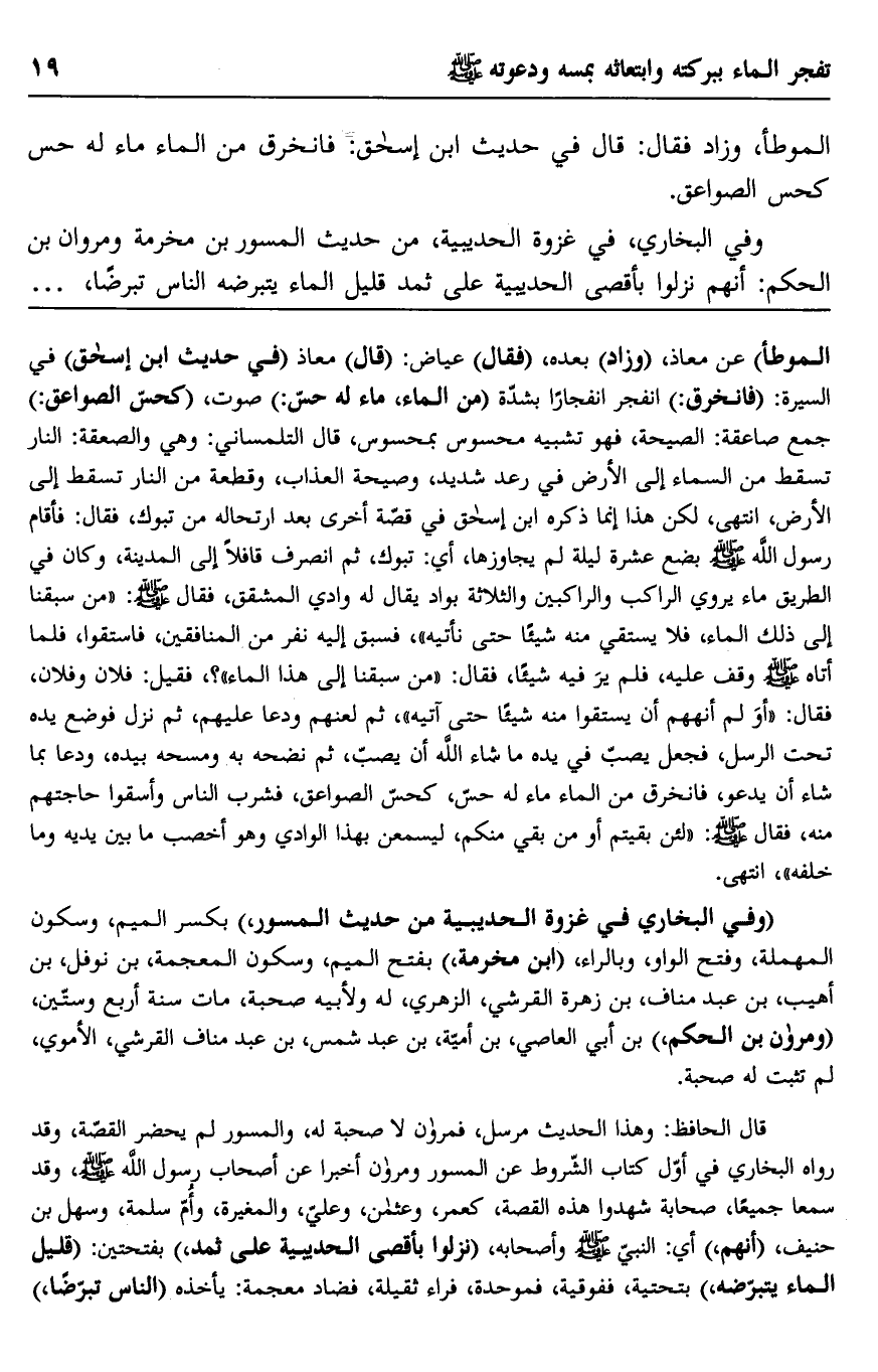 قال الحافظ: وهذا الحديث مرسل، فمروان لا صحبة له، والمسور لم يحضر القصة، وقد رواه البخاري في أول كتاب الشروط عن المسور ومروان أخبرا عن أصحاب رسول الله صلى الله عليه وسلم، وقد سمعا جميعًا، صحابة شهدوا هذه القصة، كعمر، وعثمان، وعلي، والمغيرة، وأم سلمة، وسهل بن حنيف، "أنهم"، أي: النبي صلى الله عليه وسلم وأصحابه، "نزلوا بأقصى الحديبية على ثمد" بفتحتين: "قليل الماء يتبرضه"، بتحتية، ففوقية، فموحدة، فراء ثقيلة، فضاد معجمة: يأخذه "الناس تبرضًا"