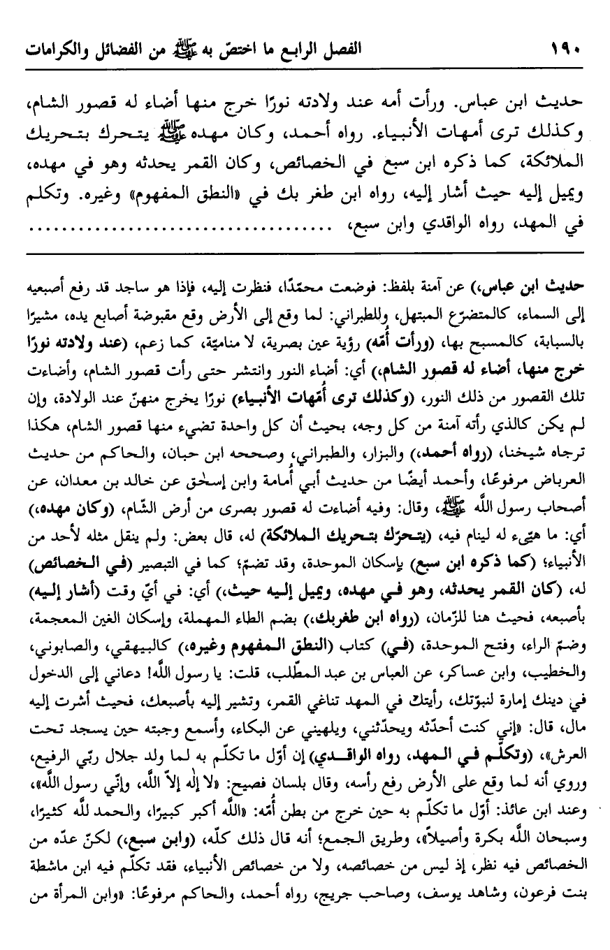 حديث ابن عباس. ورأت أمه عند ولادته نورًا خرج منها أضاء له قصور الشام، وكذلك ترى أمهات الأنبياء. رواه أحمد، وكان مهده صلى الله عليه وسلم يتحرك بتحريك الملائكة، كما ذكره ابن سبع في الخصائص، وكان القمر يحدثه وهو في مهده، ويميل إليه حيث أشار إليه، رواه ابن طغر بك في "النطق المفهوم" وغيره. وتكلم في المهد، رواه الواقدي وابن سبع.