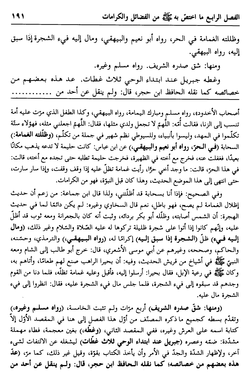 "ومنها: شق صدره الشريف" أربع مرات ولم تثبت الخامسة، "رواه مسلم وغيره" وتقدم بسطه كجميع ما ذكره المصنف من أول هذا الفصل إلى هنا في المقصد الأول إلا كتابة اسمه على العرش وغيره، ففي المقصد الثاني، "وغطه" بغين معجمة، فطاء مهملة مشددة: ضمه وعصره "جبريل عند ابتداء الوحي ثلاث غطات" ليشغله عن الالتفات لشيء آخر، ولإظهار الشدة والجد في الأمر وأن يأخذ الكتاب بقوة، وقيل غير ذلك، كما مر، "عد هذه بعضهم من خصائصه؛ كما نقله الحافظ ابن حجر، قال: ولم ينقل عن أحد من