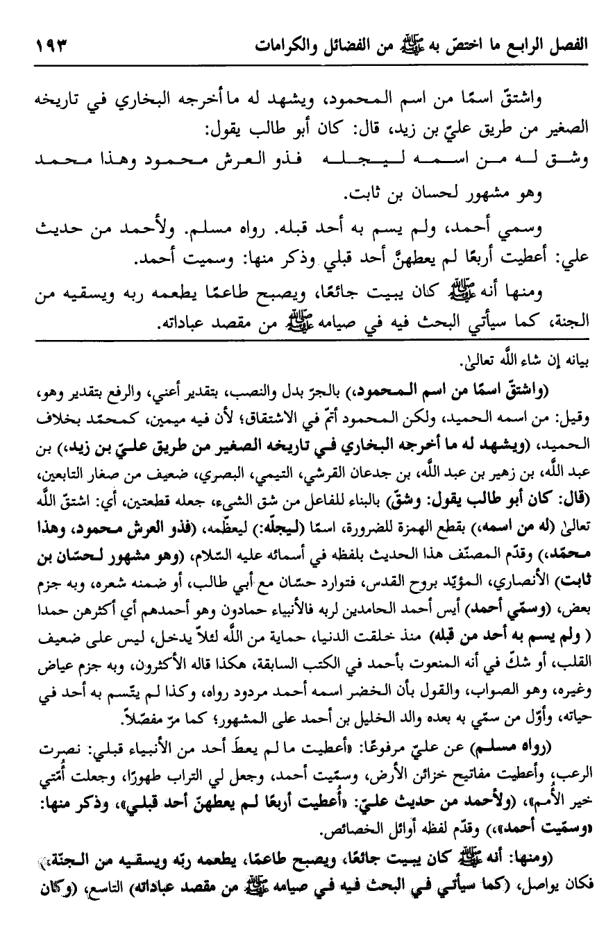 "رواه مسلم" عن علي مرفوعًا: "أعطيت ما لم يعط أحد من الأنبياء قبلي: نصرت بالرعب، وأعطيت مفاتيح خزائن الأرض، وسميت أحمد، وجعل لي التراب طهورًا، وجعلت أمتي خير الأمم". ولأحمد من حديث علي: "أعطيت أربعًا لم يعطهن أحد قبلي" وذكر منها: "وسميت أحمد" وقدم لفظه أوائل الخصائص.
