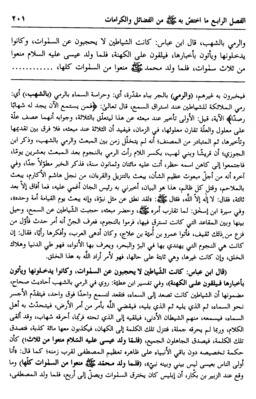 والرمي بالشهب، قال ابن عباس: كانت الشياطين لا يحجبون عن السماوات، وكانوا يدخلونها ويأتون بأخبارها، فيلقون على الكهنة، فلما ولد عيسى عليه السلام منعوا من ثلاث سموات، فلما ولد محمد صلى الله عليه وسلم منعوا من السموات كلها.