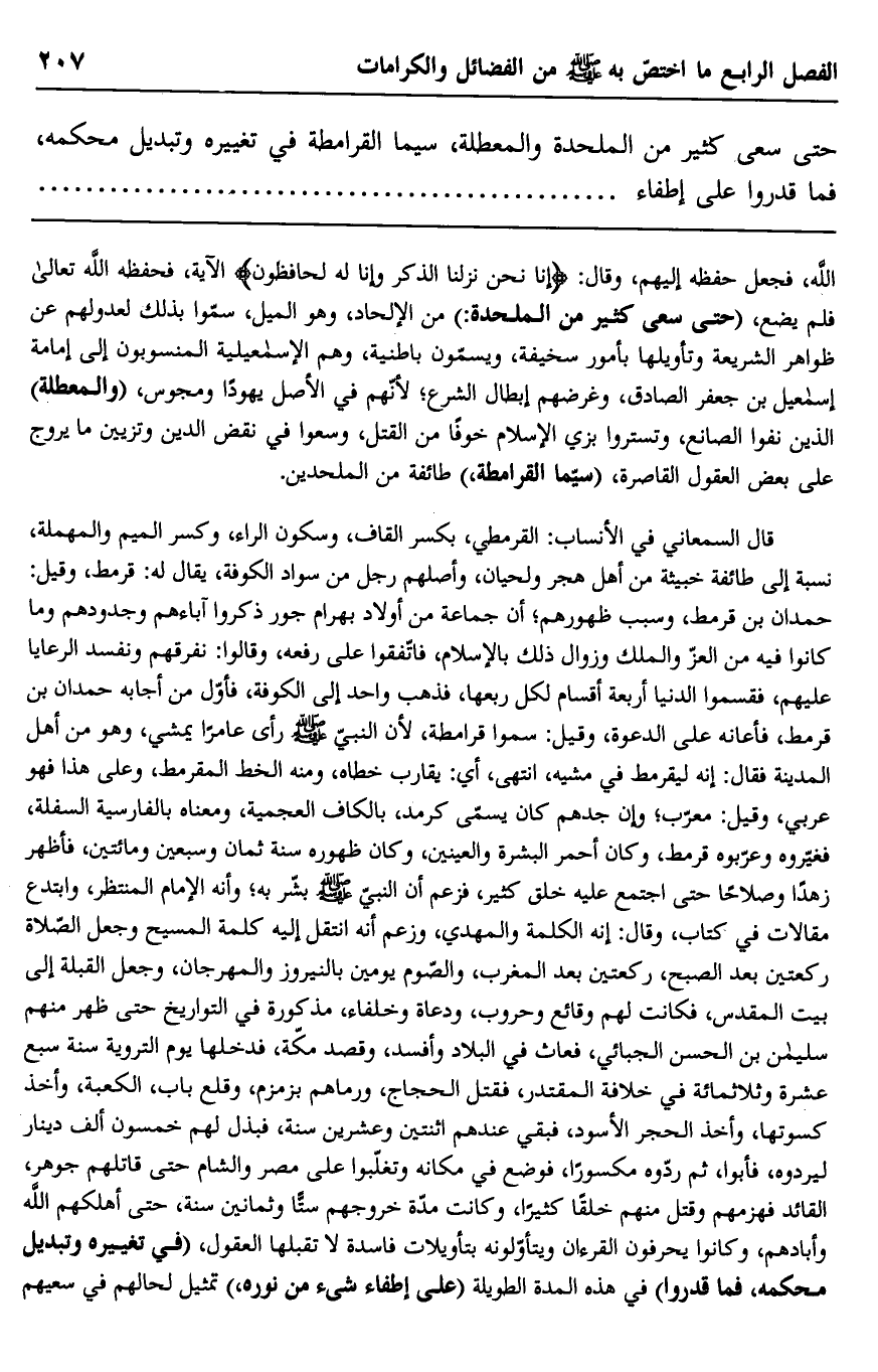 حتى سعى كثير من الملحدة والمعطلة، سيما القرامطة في تغييره وتبديل محكمه، فما قدروا على إطفاء.
