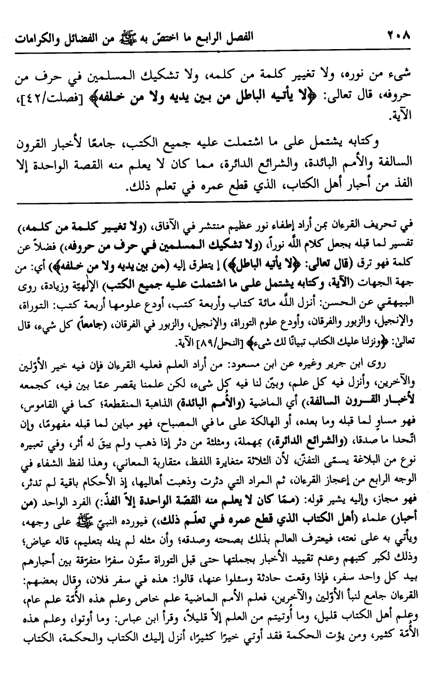 روى ابن جرير وغيره عن ابن مسعود: من أراد العلم فعليه بالقرآن فإن فيه خير الأولين والآخرين، وأنزل فيه كل علم، وبين لنا فيه كل شيء، لكن علمنا يقصر عما بين فيه، كجمعه لأخبار القرون السالفة" أي الماضية "والأمم البائدة" الذاهبة المنقطعة؛ كما في القاموس، فهو مساوٍ لما قبله وما بعده، أو الهالكة على ما في المصباح، فهو مباين لما قبله مفهومًا، وإن اتحدا ما صدقا، "والشرائع الدائرة" بمهملة، ومثلثة من دثر إذا ذهب ولم يبق له أثر، وفي تعبيره نوع من البلاغة يسمى التفنن، لأن الثلاثة متغايرة اللفظ، متقاربة المعاني، وهذا لفظ الشفاء في الوجه الرابع من إعجاز القرآن، ثم المراد التي دثرت وذهبت أهاليها، إذ الأحكام باقية لم تدثر، فهو مجاز، وإليه يشير قوله: "مما كان لا يعلم منه القصة الواحدة إلا الفذ" الفرد الواحد "من أحبار" علماء "أهل الكتاب الذي قطع عمره في تعلم ذلك" فيورده النبي صلى الله عليه وسلم على وجهه، ويأتي به على نعته، فيعترف العالم بذلك بصحته وصدقه؛ وأن مثله لم ينله بتعليم، قال عياض؛ وذلك لكبر كتبهم وعدم تقييد الأخبار بجملتها حتى قبل التوراة ستون سفرًا متفرقة بين أحبارهم بيد كل واحد سفر، فإذا وقعت حادثة وسئلوا عنها، قالوا: هذا في سفر فلان، وقال بعضهم: القرآن جامع لنبأ الأولين والآخرين، فعلم الأمم الماضية علم خاص وعلم هذه الأمة علم عام، وعلم أهل الكتاب قليل، وما أوتيتم من العلم إلا قليلا، وقرأ ابن عباس: وما أوتوا، وعلم هذه الأمة كثير، ومن يؤت الحكمة فقد أوتي خيرًا كثيرًا، أنزل إليك الكتاب والحكمة، الكتاب