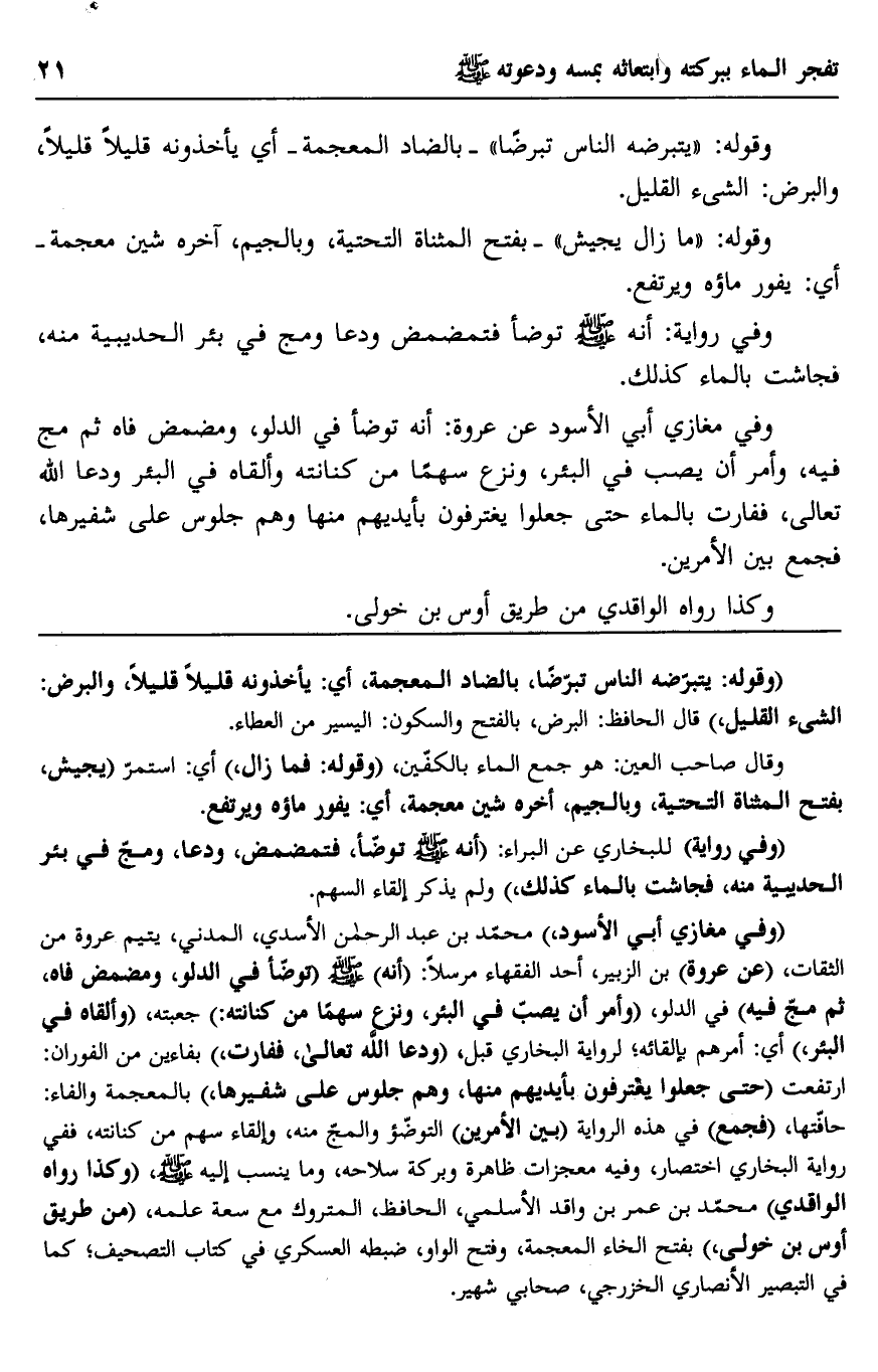 وفي مغازي أبي الأسود عن عروة: أنه توضأ في الدلو، ومضمض فاه ثم مج فيه، وأمر أن يصب في البئر، ونزع سهمًا من كنانته وألقاه في البئر ودعا الله تعالى، ففارت بالماء حتى جعلوا يغترفون بأيديهم منها وهم جلوس على شفيرها، فجمع بين الأمرين.