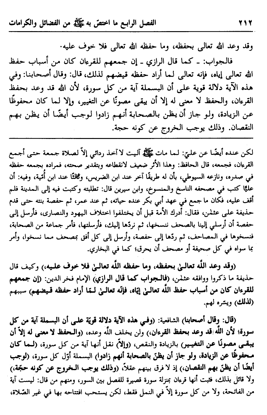"وقد وعد الله تعالى بحفظه، وما حفظه الله تعالى فلا خوف عليه" وكيف قال حذيفة ما ذكروا ووافقه عثمان، "فالجواب كما قال الرازي" الإمام فخر الدين: "إن جمعهم للقرآن كان من أسباب حفظ الله تعالى إياه، فإنه تعالى لما أراد حفظه قيضهم" سببهم "لذلك" ويسره لهم.
