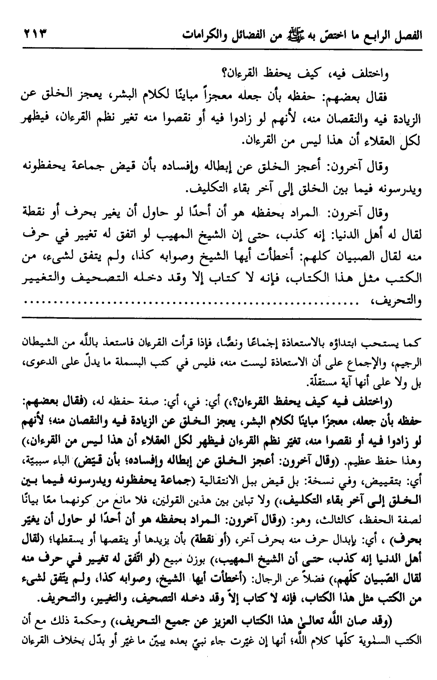 "وقد صان الله تعالى هذا الكتاب العزيز عن جميع التحريف" وحكمة ذلك مع أن الكتب السماوية كلها كلام الله؛ أنها إن غيرت جاء نبي بعده يبين ما غير أو بدل بخلاف القرآن
