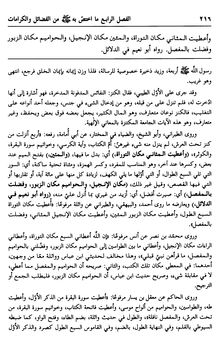 وأعطيت المثاني مكان التوراة، والمئين مكان الإنجيل، والحواميم مكان الزبور وفضلت بالمفصل". رواه أبو نعيم في الدلائل.