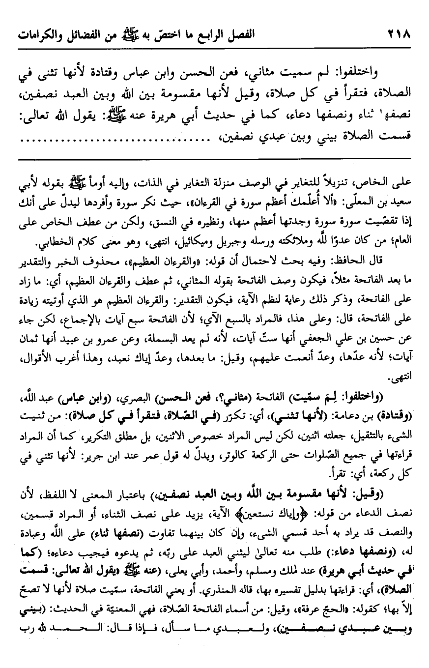 واختلفوا: لم سميت مثاني، فعن الحسن وابن عباس وقتادة لأنها تثنى في الصلاة، فتقرأ في كل صلاة، وقيل لأنها مقسومة بين الله وبين العبد نصفين، نصفها ثناء ونصفها دعاء، كما في حديث أبي هريرة عنه صلى الله عليه وسلم: "يقول الله تعالى: قسمت الصلاة بيني وبين عبدي نصفين".