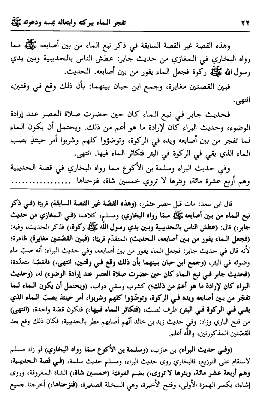 وفي حديث البراء وسلمة بن الأكوع مما رواه البخاري في قصة الحديبية وهم أربع عشرة مائة، وبئرها لا تروي خمسين شاة، فنزحناها.