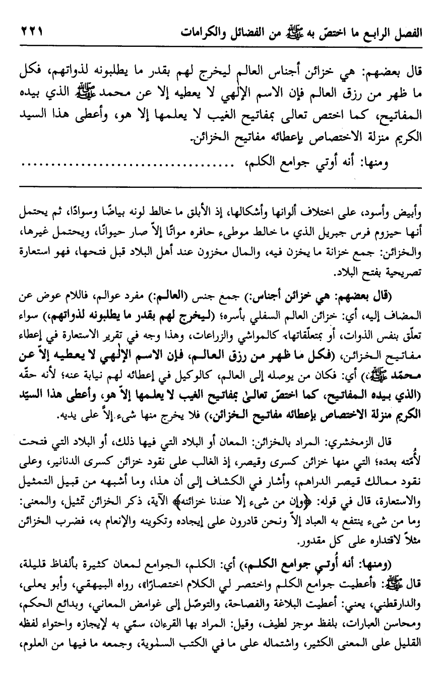 "ومنها: أنه أوتي جوامع الكلم" أي: الكلم، الجوامع لمعان كثيرة بألفاظ قليلة، قال صلى الله عليه وسلم: "أعطيت جوامع الكلم واختصر.لي الكلام اختصارًا" رواه البيهقي، وأبو يعلى، والدارقطني، يعني: أعطيت البلاغة والفصاحة، والتوصل إلى غوامض المعاني، وبدائع الحكم، ومحاسن العبارات، بلفظ موجز لطيف، وقيل: المراد بها القرآن، سمي به لإيجازه واحتواء لفظه القليل على المعنى الكثير، واشتماله على ما في الكتب السماوية، وجمعه ما فيها من العلوم،