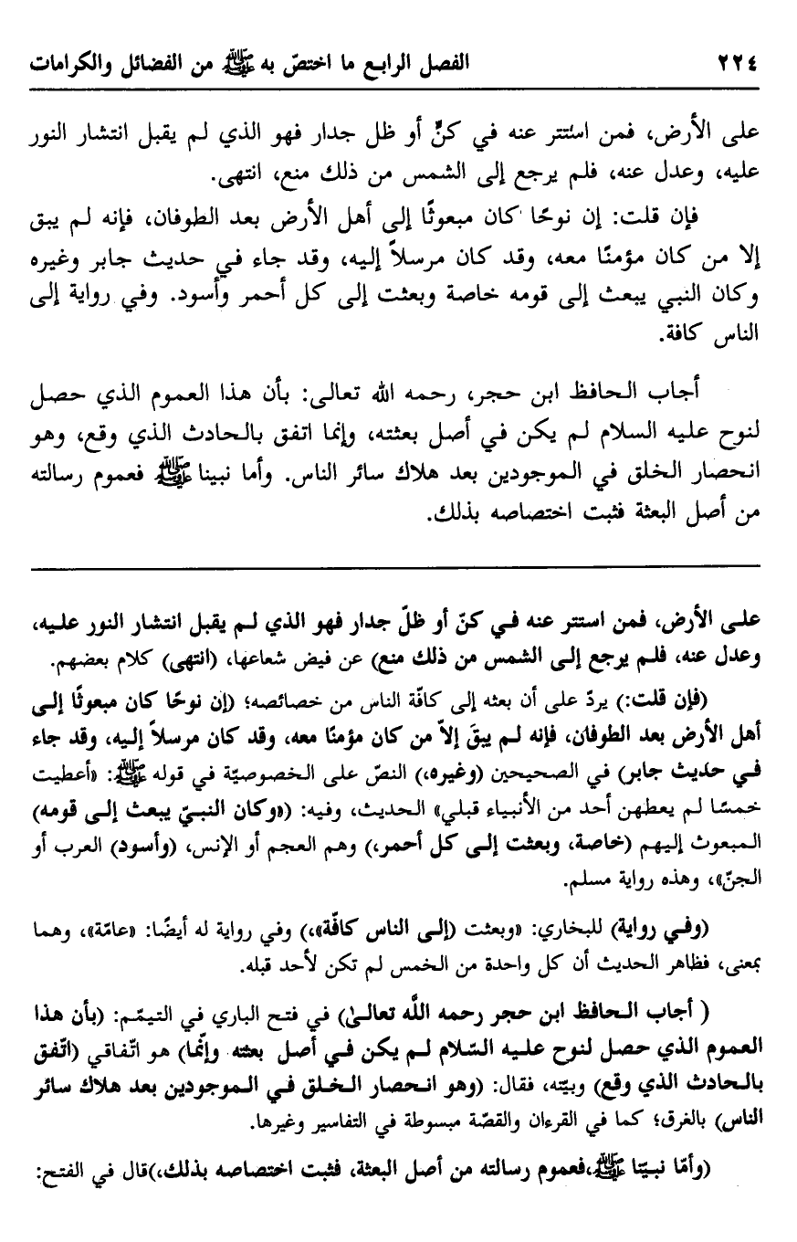أجاب الحافظ ابن حجر، رحمه الله تعالى: بأن هذا العموم الذي حصل لنوح عليه الصلاة لم يكن في أصل بعثته، وإنما اتفق بالحادث الذي وقع، وهو انحصار الخلق في الموجودين بعد هلاك سائر الناس. وأما نبينا صلى الله عليه وسلم فعموم رسالته من أصل البعثة فثبت اختصاصه بذلك.