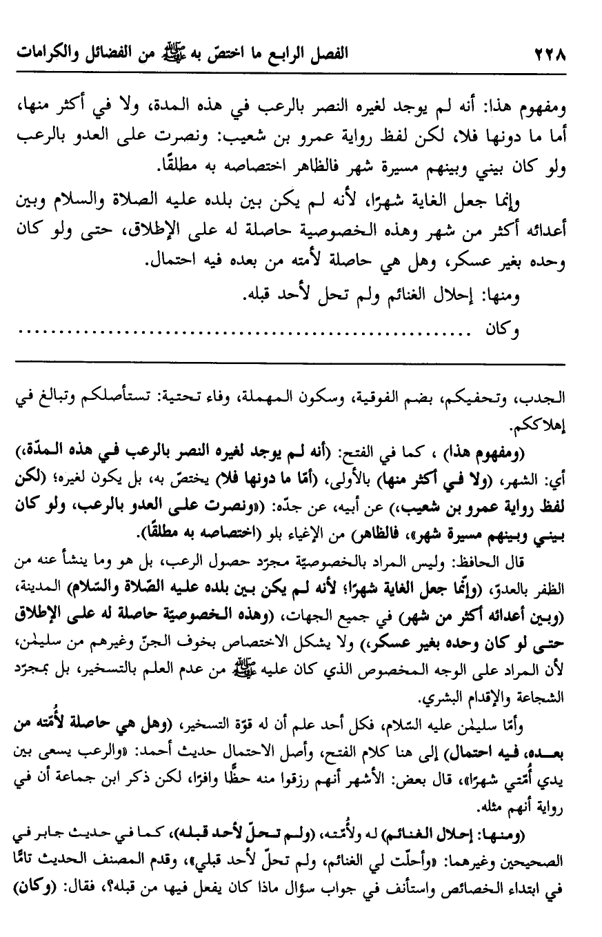 قال الحافظ: وليس المراد بالخصوصية مجرد حصول الرعب، بل هو وما ينشأ عنه من الظفر بالعدو، "وإنما جعل الغاية شهرًا؛ لأنه لم يكن بين بلده عليه الصلاة والسلام" المدينة، "وبين أعدائه أكثر من شهر" في جميع الجهات، "وهذه الخصوصية حاصلة له على الإطلاق حتى لو كان وحده بغير عسكر" ولا يشكل الاختصاص بخوف الجن وغيرهم من سليمان، لأن المراد على الوجه المخصوص الذي كان عليه صلى الله عليه وسلم من عدم العلم بالتسخير، بل بمجرد الشجاعة والإقدام البشري.