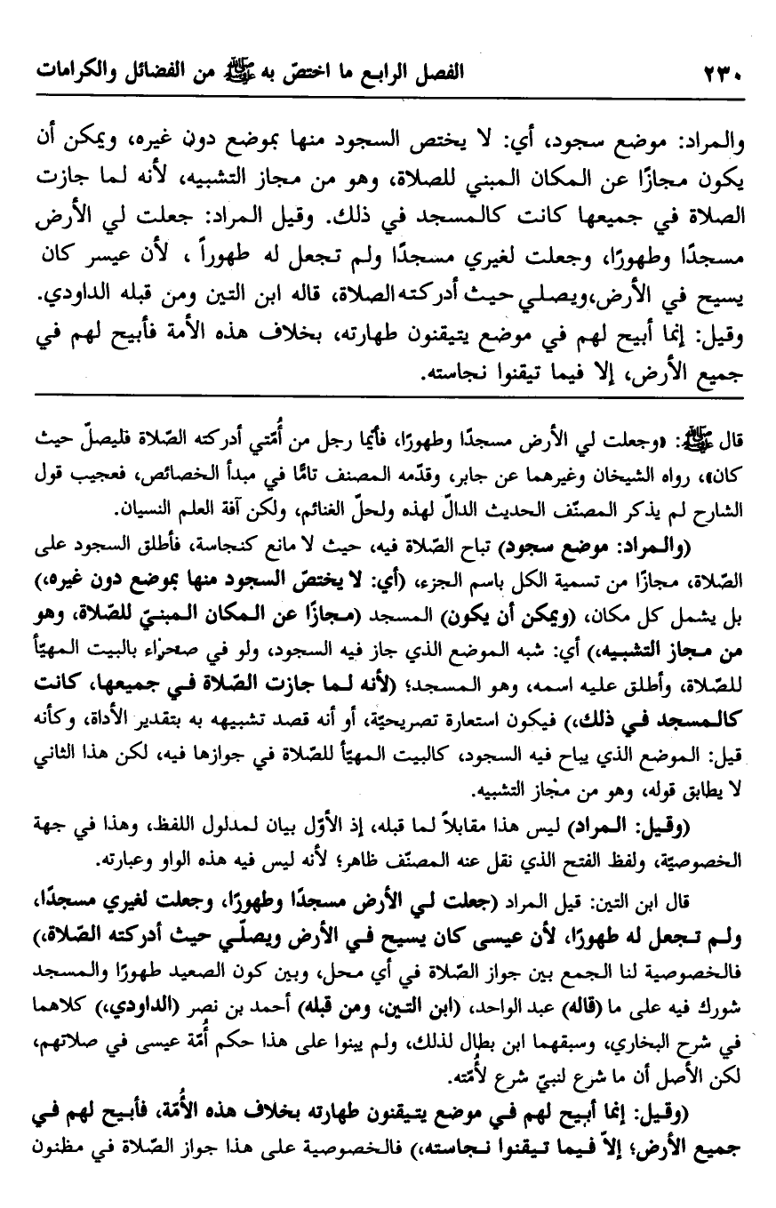 والمراد: موضع سجود، أي: لا يختص السجود منها بموضع دون غيره، ويمكن أن يكون مجازًا عن المكان المبني للصلاة، وهو من مجاز التشبيه، لأنه لما جازت الصلاة في جميعها كانت كالمسجد في ذلك. وقيل المراد: جعلت لي الأرض مسجدًا وطهورًا، وجعلت لغيري مسجدًا ولم تجعل له طهورًا، لأن عيسر كان يسيح في الأرض، ويصلي حيث أدركته الصلاة، قاله ابن التين ومن قبله الداودي. وقيل: إنما أبيح لهم في موضع يتيقنون طهارته، بخلاف هذه الأمة فأبيح لهم في جميع الأرض، إلا فيما تيقنوا نجاسته.