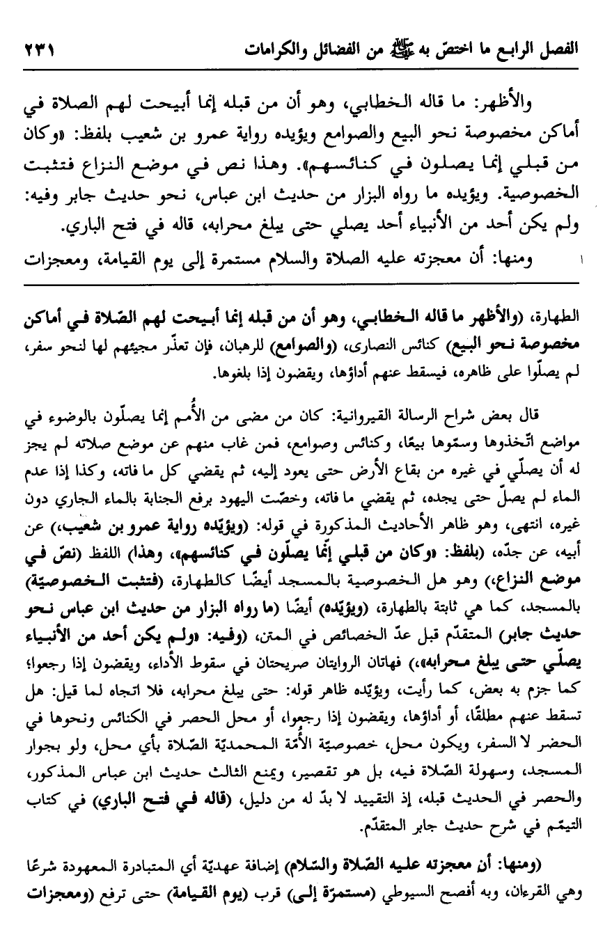 قال بعض شراح الرسالة القيروانية: كان من مضى من الأمم إنما يصلون بالوضوء في مواضع اتخذوها وسموها بيعًا، وكنائس وصوامع، فمن غاب منهم عن موضع صلاته لم يجز له أن يصلي في غيره من بقاع الأرض حتى يعود إليه، ثم يقضي كل ما فاته، وكذا إذا عدم الماء لم يصل حتى يجده، ثم يقضي ما فاته، وخصت اليهود برفع الجنابة بالماء الجاري دون غيره، انتهى، وهو ظاهر الأحاديث المذكورة في قوله: "ويؤيده رواية عمرو بن شعيب" عن أبيه، عن جده، "بلفظ: "وكان من قبلي إنما يصلون في كنائسهم". وهذا" اللفظ "نص في موضع النزاع" وهو هل الخصوصية بالمسجد أيضًا كالطهارة، "فتثبت الخصوصية" بالمسجد، كما هي ثابتة بالطهارة، "ويؤيده" أيضًا "ما رواه البزار من حديث ابن عباس نحو حديث جابر" المتقدم قبل عد الخصائص في المتن، "وفيه: ولم يكن أحد من الأنبياء يصلي حتى يبلغ محرابه" فهاتان الروايتان صريحتان في سقوط الأداء، ويقضون إذا رجعوا؛ كما جزم به بعض، كما رأيت، ويؤيده ظاهر قوله: حتى يبلغ محرابه، فلا اتجاه لما قيل: هل سقط عنهم مطلقًا، أو أداؤها، ويقضون إذا رجعوا، أو محل الحصر في الكنائس ونحوها في الحضر لا السفر، ويكون محل خصوصية الأمة المحمدية الصلاة بأي محل، ولو بجوار المسجد، وسهولة الصلاة فيه، بل هو تقصير، ويمنع الثالث حديث ابن عباس المذكور والحصر في الحديث قبله، إذ التقييد لا بد له من دليل، "قاله في فتح الباري" في كتاب التيمم في شرح حديث جابر المتقدم.