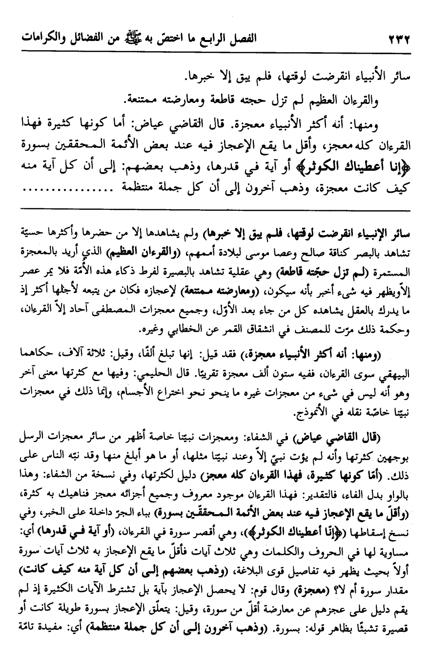 ومنها: أنه أكثر الأنبياء معجزة. قال القاضي عياض: أما كونها كثيرة فهذا القرآن كله معجز، وأقل ما يقع الإعجاز فيه عند بعض الأئمة المحققين بسورة {إِنَّا أَعْطَيْنَاكَ الْكَوْثَرَ} أو آية في قدرها، وذهب بعضهم: إلى أن كل آية منه كيف كانت معجزة، وذهب آخرون إلى أن كل جملة منتظمة.