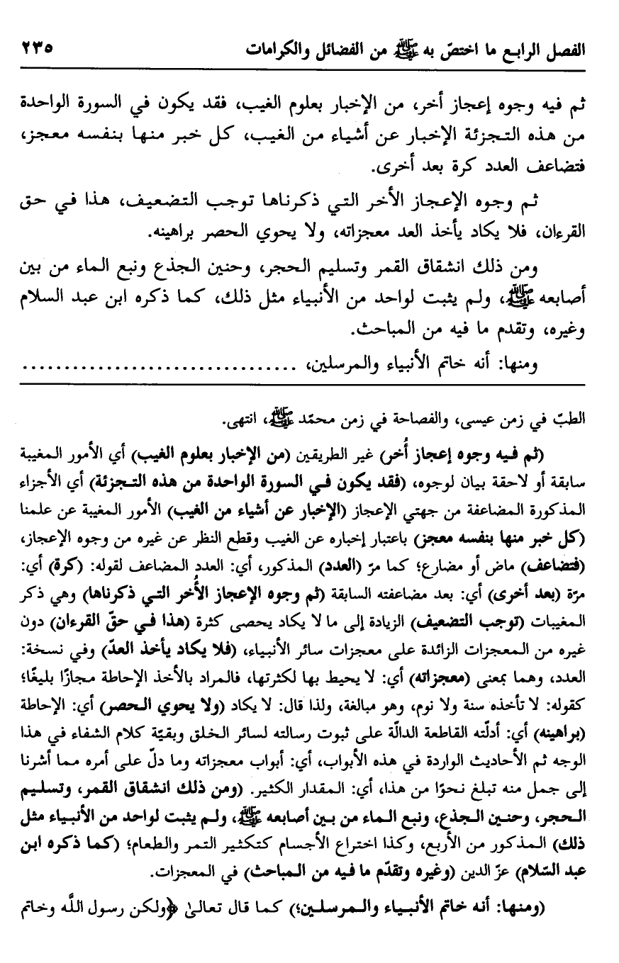 "ثم فيه وجوه إعجاز آخر" غير الطريقين "من الإخبار بعلوم الغيب" أي الأمور المغيبة سابقة أو لاحقة بيان لوجوه، "فقد يكون في السورة الواحدة من هذه التجزئة" أي الأجزاء المذكورة المضاعفة من جهتي الإعجاز "الإخبار عن أشياء من الغيب" الأمور المغيبة عن علمنا "كل خبر منها بنفسه معجز" باعتبار إخباره عن الغيب وقطع النظر عن غيره من وجوه الإعجاز، "فتضاعف" ماض أو مضارع؛ كما مر "العدد" المذكور، أي: العدد المضاعف لقوله: "كرة" أي: مرة "بعد أخرى" أي: بعد مضاعفته السابقة "ثم وجوه الإعجاز الآخر التي ذكرناها" وهي ذكر المغيبات "توجب التضعيف" الزيادة إلى ما لا يكاد يحصى كثرة "هذا في حق القرآن" دون غيره من المعجزات الزائدة على معجزات سائر الأنبياء، "فلا يكاد يأخذ العد" وفي نسخة: العدد، وهما بمعنى "معجزاته" أي: لا يحيط بها لكثرتها، فالمراد بالأخذ الإحاطة مجازًا بليغًا؛ كقوله: {لَا تَأْخُذُهُ سِنَةٌ وَلَا نَوْمٌ} ، وهو مبالغة، ولذا قال: لا يكاد "ولا يحوي الحصر" أي: الإحاطة "براهينه" أي: أدلته القاطعة الدالة على ثبوت رسالته لسائر الخلق وبقية كلام الشفاء في هذا الوجه ثم الأحاديث الواردة في هذه الأبواب، أي: أبواب معجزاته وما دل على أمره مما أشرنا إلى جمل منه تبلغ نحوًا من هذا، أي: المقدار الكثير. "ومن ذلك انشقاق القمر، وتسليم الحجر، وحنين الجذع، ونبع الماء من بين أصابعه صلى الله عليه وسلم، ولم يثبت لواحد من الأنبياء مثل ذلك" المذكور من الأربع، وكذا اختراع الأجسام كتكثير التمر والطعام؛ "كما ذكره ابن عبد السلام عز الدين "وغيره وتقدم ما فيه من المباحث" في المعجزات.