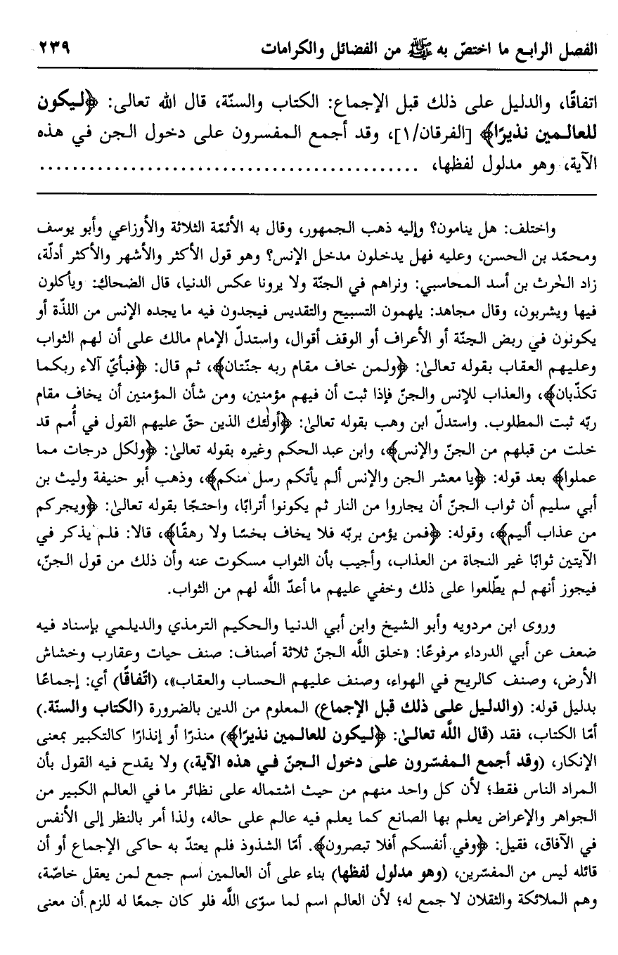 وروى ابن مردويه وأبو الشيخ وابن أبي الدنيا والحكيم الترمذي والديلمي بإسناد فيه ضعف عن أبي الدرداء مرفوعًا: "خلق الله الجن ثلاثة أصناف: صنف حيات وعقارب وخشاش الأرض، وصنف كالريح في الهواء، وصنف عليهم الحساب والعقاب" "اتفاقًا" أي: إجماعًا بدليل قوله: "والدليل على ذلك قبل الإجماع" المعلوم من الدين بالضرورة "الكتاب والسنة" أما الكتاب، فقد "قال الله تعالى: {لِيَكُونَ لِلْعَالَمِينَ نَذِيرًا} منذرًا أو إنذارًا كالتكبير بمعنى الإنكار، "وقد أجمع المفسرون على دخول الجن في هذه الآية" ولا يقدح فيه القول بأن المراد الناس فقط؛ لأن كل واحد منهم من حيث اشتماله على نظائر ما في العالم الكبير من الجواهر والأعراض يعلم بها الصانع كما يعلم فيه عالم على حاله، ولذا أمر بالنظر إلى الأنفس في الآفاق، فقيل: {وَفِي أَنْفُسِكُمْ أَفَلَا تُبْصِرُونَ} أما الشذوذ فلم يعتد به حاكى الإجماع أو أن قائله ليس من المفسرين، "وهو مدلول لفظها" بناء على أن العالمين اسم جمع لمن يعقل خاصة، وهم الملائكة والثقلان لا جمع له؛ لأن العالم اسم لما سوى الله فلو كان جمعًا له للزم أن معنى