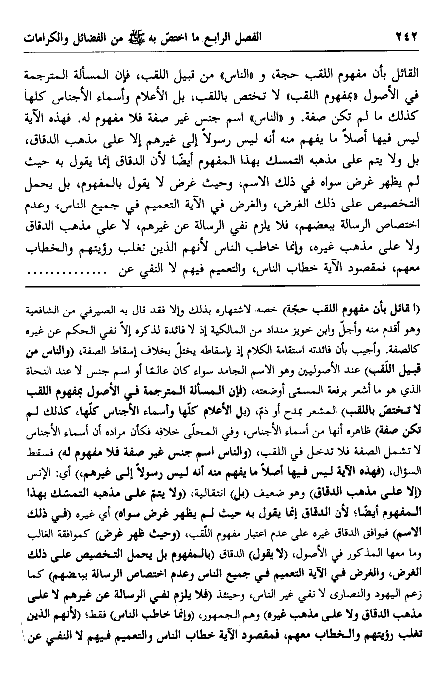 القائل بأن مفهوم اللقب حجة، و"الناس" من قبيل اللقب، فإن المسألة المترجمة في الأصول "بمفهوم اللقب" لا تختص باللقب، بل الأعلام وأسماء الأجناس كلها كذلك ما لم تكن صفة. و"الناس" اسم جنس غير صفة فلا مفهوم له. فهذه الآية ليس فيها أصلا ما يفهم منه أنه ليس رسولا إلى غيرهم إلا على مذهب الدقاق، بل ولا يتم على مذهبه التمسك بهذا المفهوم أيضًا لأن الدقاق إنما يقول به حيث لم يظهر غرض سواه في ذلك الاسم، وحيث غرض لا يقول بالمفهوم، بل يحمل التخصيص على ذلك الغرض، والغرض في الآية التعميم في جميع الناس، وعدم اختصاص الرسالة ببعضهم، فلا يلزم نفي الرسالة عن غيرهم، لا على مذهب الدقاق ولا على مذهب غيره، وإنما خاطب الناس لأنهم الذين تغلب رؤيتهم والخطاب معهم، فمقصود الآية خطاب الناس، والتعميم فيهم لا النفي عن.