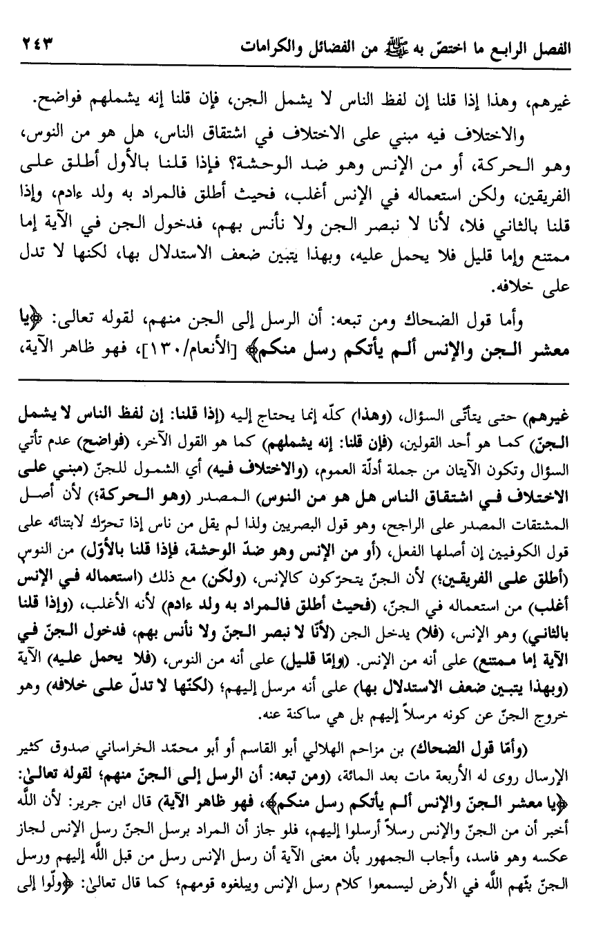 وأما قول الضحاك ومن تبعه: أن الرسل إلى الجن منهم، لقوله تعالى: {يَا مَعْشَرَ الْجِنِّ وَالْإِنْسِ أَلَمْ يَأْتِكُمْ رُسُلٌ مِنْكُمْ} [الأنعام: 130] ، فهو ظاهر الآية،